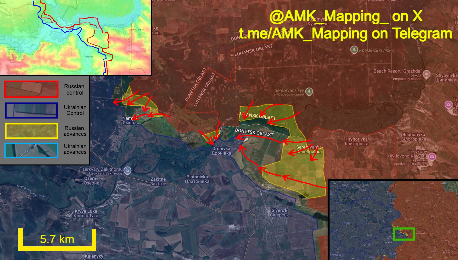Ở phía đông, quân đội Nga tiếp tục xâm nhập qua các cánh đồng hướng về Dronivka và đã củng cố được vị trí trong khu mỏ. Từ đó, họ đang xâm nhập về phía mỏ phấn phía đông Dronivka. Kết quả là, Ukraine buộc phải rút khỏi làng Serebryanka và hiện đang phòng thủ từ ba hướng tại Dronivka. Quân đội Nga cũng đã chiếm lại phần còn lại của Serebryanka, cũng như các vị trí xung quanh, và hiện đang cố gắng thiết lập vị trí cố định tại mỏ phấn.