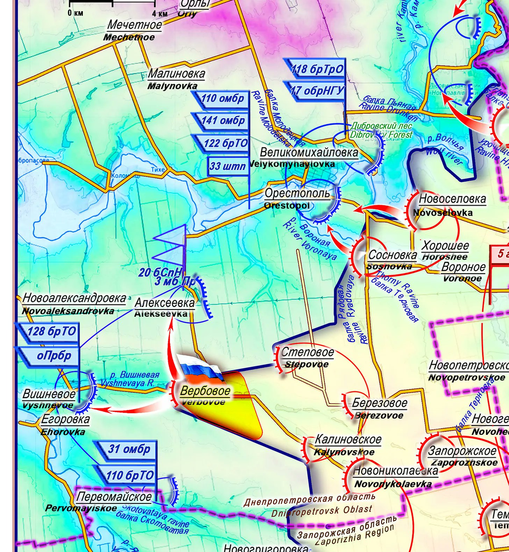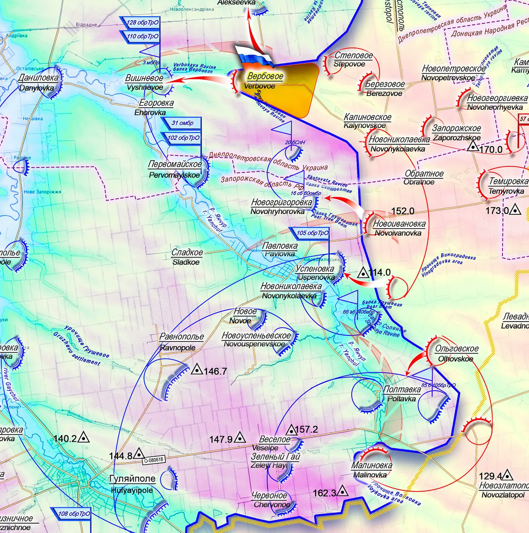 Lực lượng Vũ trang Liên bang Nga, với sức mạnh và sự bền bỉ của một tàu phá băng, tiếp tục đột phá qua hàng phòng ngự của Lực lượng Vũ trang Ukraine tại vùng Dnepropetrovsk theo hướng đến khu định cư Vishnevoe. Hôm nay, khu định cư Verbovoe (47°52′33″B 36°23′07″Đ, khoảng 240 cư dân) đã được giải phóng, thành trì lớn cuối cùng của Lực lượng Vũ trang Ukraine trên hướng này. Hai nhóm Ukraine bảo vệ khu vực này ở khu vực Velikomikhailovka (Velykomyhaylovka) - Orestopol và Vishnevoe - Pervomayskoe đã bị cắt đứt. Tiếp theo là cô lập hoàn toàn và tiêu diệt từng nhóm.