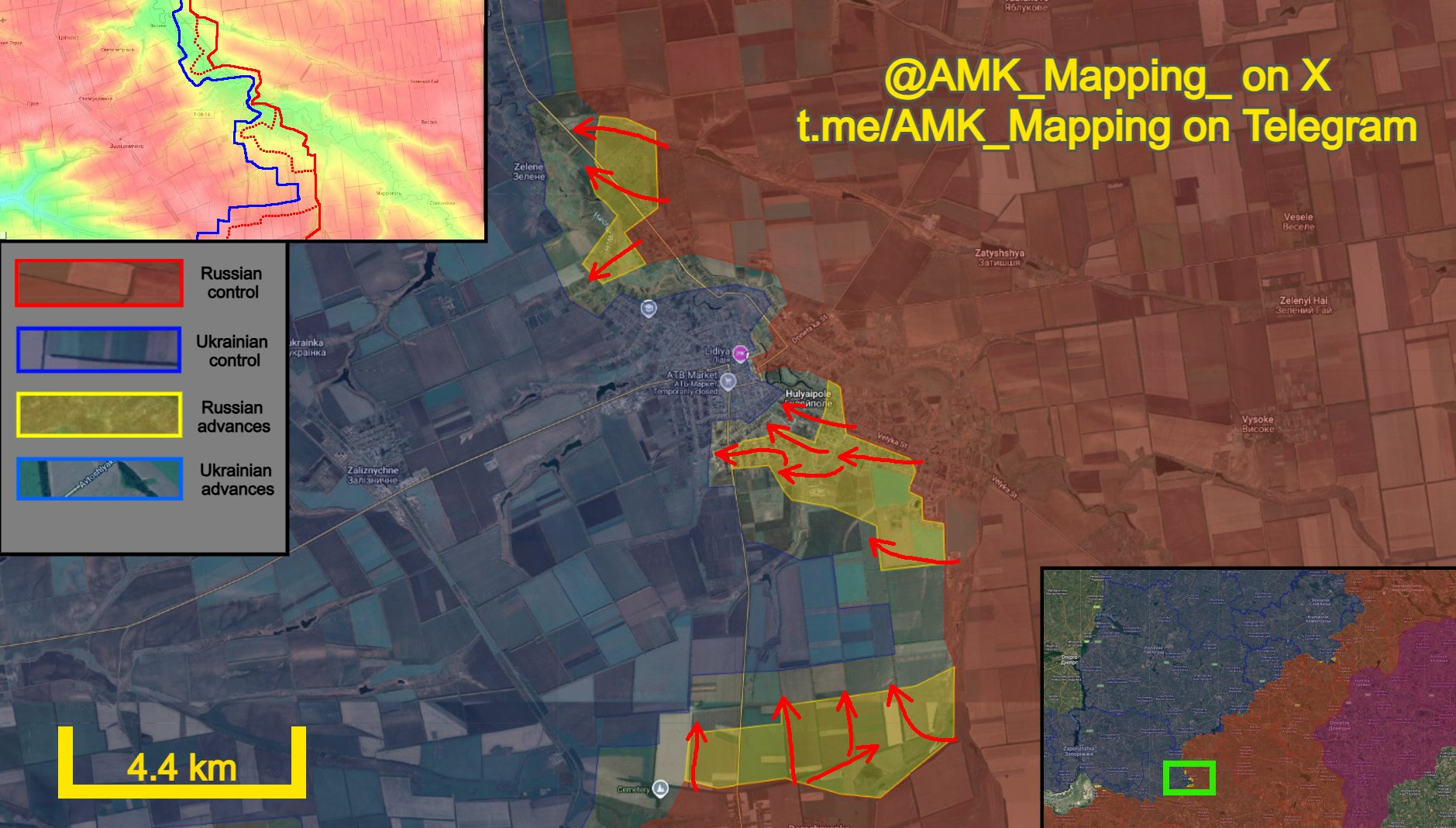 Ở phía nam, lực lượng Nga đã tiến hành một loạt các cuộc tấn công trong tuần qua nhằm loại bỏ cứ điểm của Ukraine ở phía nam Hulyaipole. Họ đã tiến được về phía bắc từ khu vực Dorozhnyanka, chiếm giữ các vị trí tại 7 hàng cây khác nhau trên các ngọn đồi chiến thuật mà họ đã giữ vững trong hơn 3,5 năm.