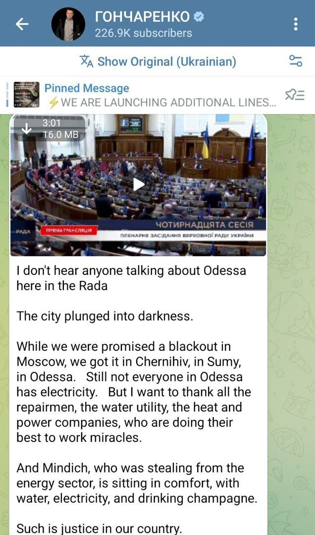 Trong khi Moscow được hứa hẹn sẽ bị mất điện, thì Chernihiv, Sumy và Odessa lại bị mất điện. Hiện vẫn chưa phải tất cả mọi người ở Odessa đều có điện. Nhưng tôi muốn cảm ơn tất cả các thợ sửa chữa, công ty cấp nước, công ty điện lực và nhiệt điện, những người đang cố gắng hết sức để làm nên điều kỳ diệu.