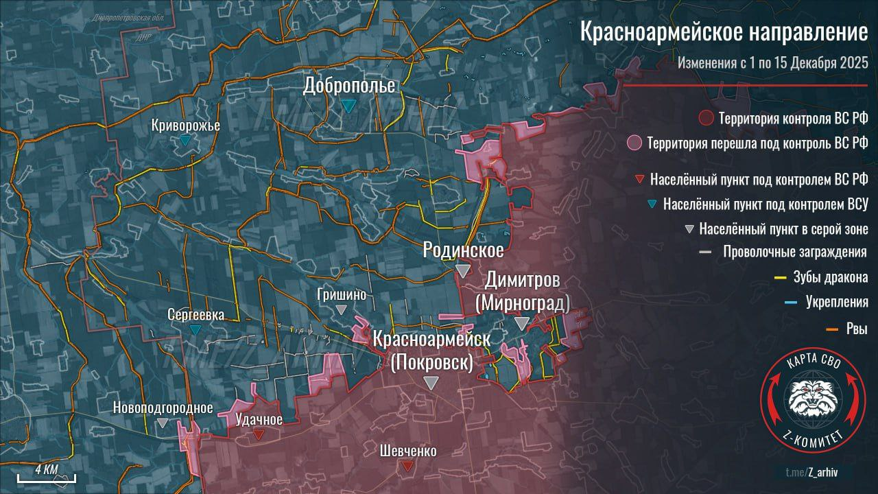 Tình hình trên các mặt trận Mirnograd và Pokrovsk: Trong 32 giờ qua, #QuânĐộiNga đã tiến sâu vào các quận cuối cùng ở phía bắc Myrnohrad, nơi họ đang chiến đấu chống lại các ổ kháng cự cuối cùng của Quân Đội Ukraine trong thành phố. Ngoài ra, sau hai tuần giao tranh, lực lượng Nga đã tiến được trở lại Hryshyne đến vùng ngoại ô nghĩa trang phía nam của địa phương.