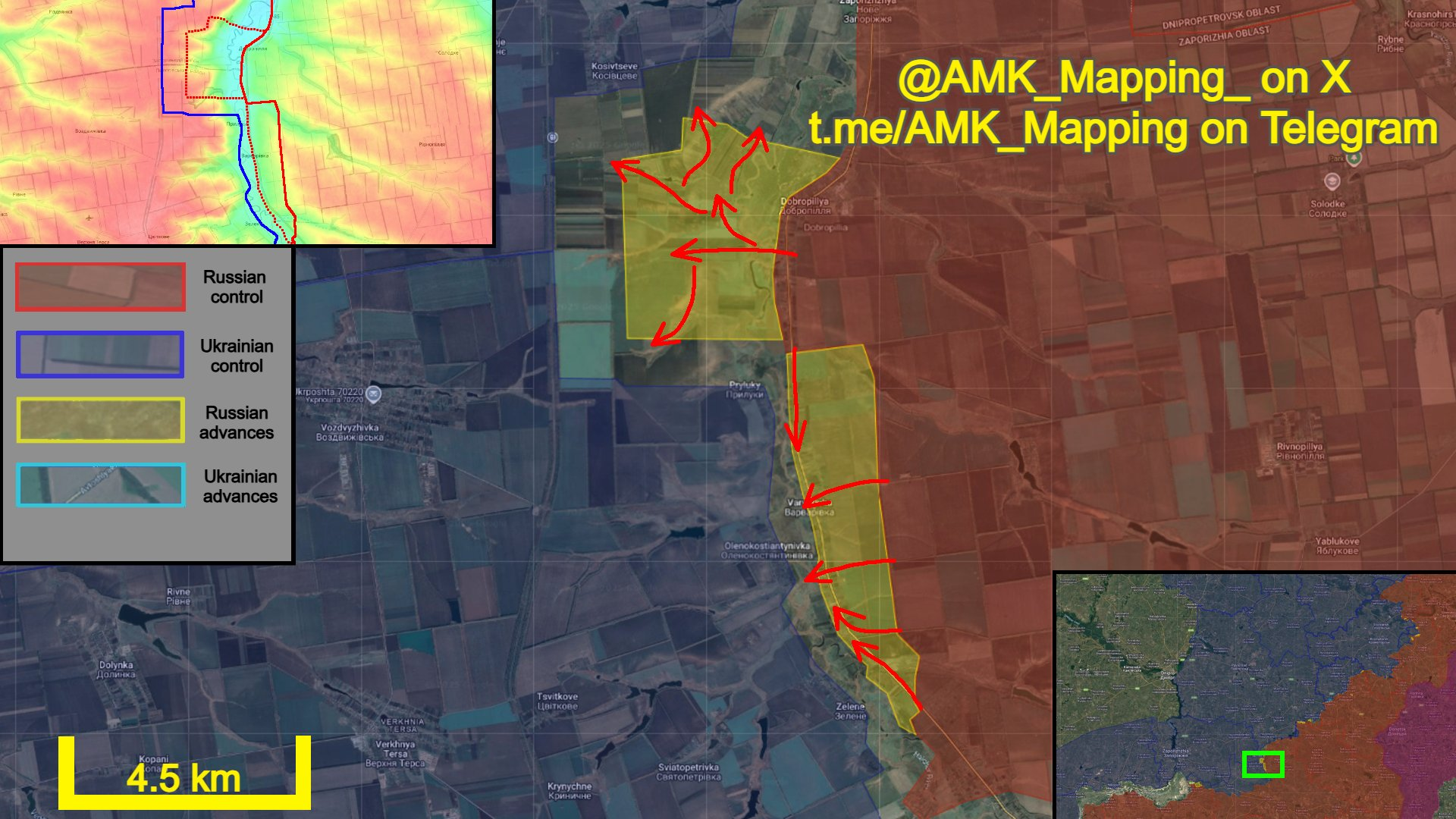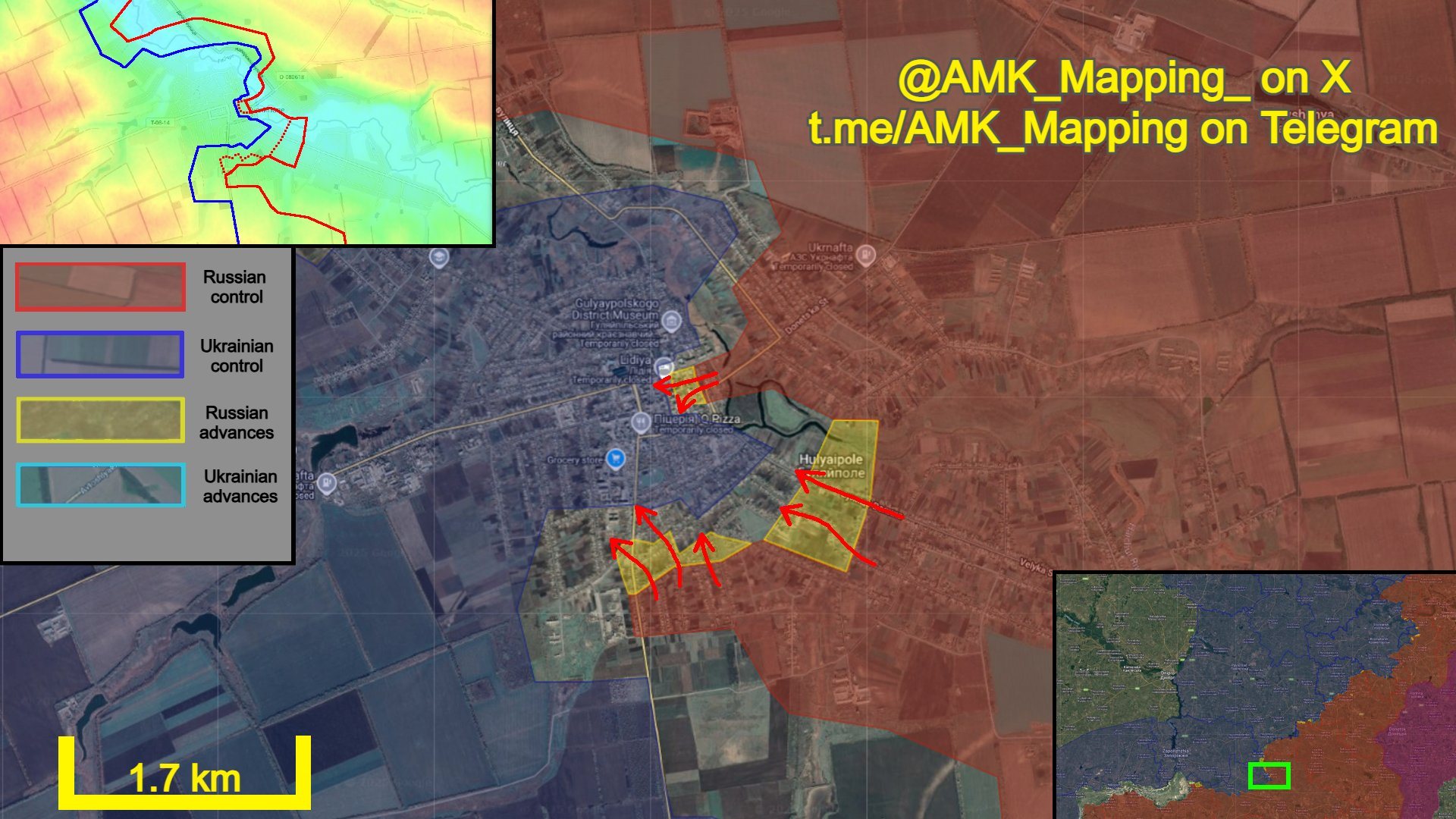 Ở phía nam Hulyaipole, lực lượng Nga tiếp tục mở rộng mũi nhọn tấn công, vòng qua nghĩa trang từ phía tây và chiếm giữ các vị trí trên đường Kooperatynvna. Xa hơn về phía tây, các lực lượng khác tiếp tục tiến về phía bắc hướng tới các tòa nhà cao tầng, vốn đã trở thành cứ điểm chính của Ukraine trong thành phố. Dưới sự yểm trợ không quân dày đặc, họ đã tiến đến giao lộ đường Vyshneva và đường cao tốc chính và hiện đang giao tranh ác liệt để giành quyền kiểm soát các lối vào trường trung học địa phương, nằm ngay trước các tòa nhà chung cư.