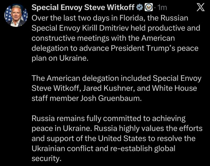 Đặc phái viên Steve Witkoff : Trong hai ngày qua tại Florida, Đặc phái viên Nga Kirill Dmitriev đã có các cuộc gặp gỡ hiệu quả và mang tính xây dựng với phái đoàn Mỹ nhằm thúc đẩy kế hoạch hòa bình của Tổng thống Trump về Ukraine. Phái đoàn Mỹ bao gồm Đặc phái viên Steve Witkoff, Jared Kushner và thành viên Nhà Trắng Josh Gruenbaum. Nga vẫn hoàn toàn cam kết đạt được hòa bình ở Ukraine. Nga đánh giá cao những nỗ lực và sự hỗ trợ của Hoa Kỳ trong việc giải quyết xung đột Ukraine và thiết lập lại an ninh toàn cầu.