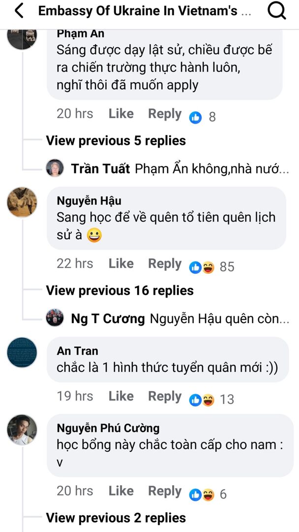 Hôm bữa SQ U cà đăng bài cho học bổng đi học các ngành XH và Tự nhiên. Đọc comment thì phần lớn mọi người đều bảo là thật chill khi nhập học sẽ được học môn Lật Sử, học về tư tưởng Bandera, sau đó sẽ được ra trận thực tập và nằm ngửa bụng. Đọc comment giải trí phết và thấy dân mình tỉnh, bả dân chủ chắc khó rồi, dù vẫn cần cẩn thận!