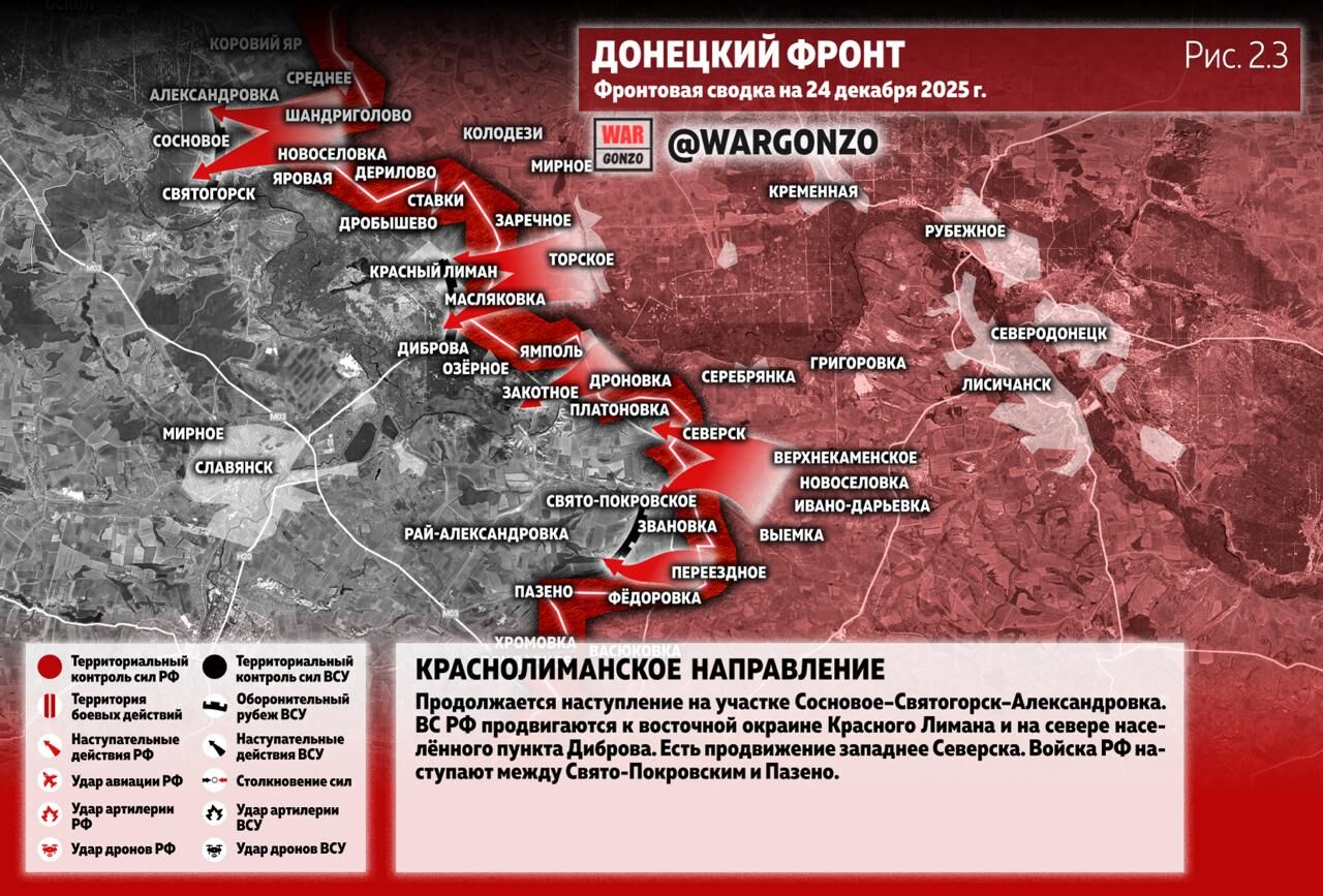 Trên mặt trận Krasnolimansky, cuộc tấn công tiếp tục diễn ra ở khu vực Sosnovoe-Svyatogorsk-Aleksandrovka. Lực lượng vũ trang Nga đang tiến về phía ngoại ô phía đông của Krasny Liman và phía bắc làng Dibrova. Cũng có tiến triển ở phía tây Seversk. Lực lượng Nga đang tiến giữa Svyato-Pokrovskoe và Pazeno. (Hình 2.2)