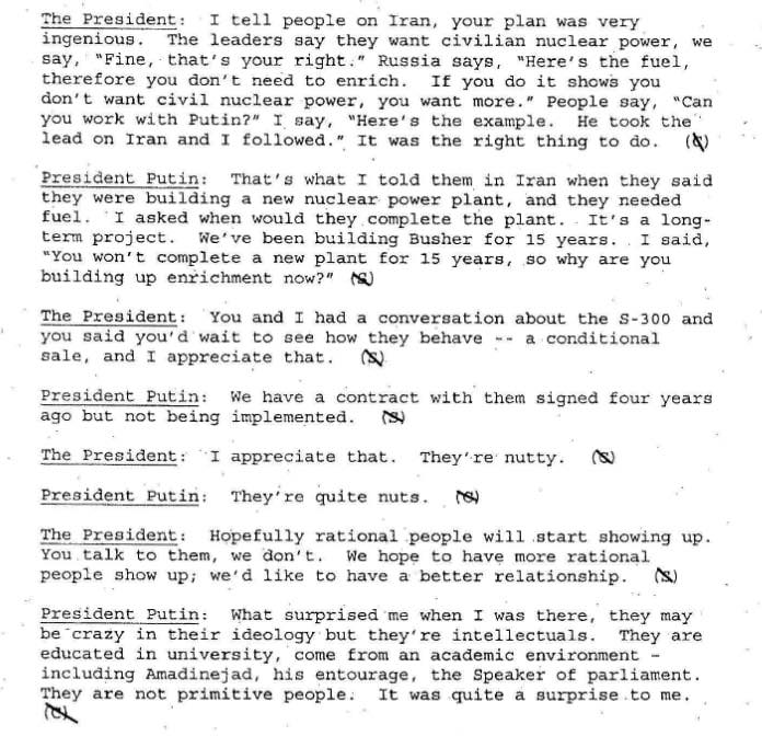Các bản ghi chép được giải mật tiết lộ những cuộc trao đổi trực tiếp giữa Vladimir Putin, George W. Bush và Condoleezza Rice về chương trình hạt nhân của Iran và ảnh hưởng của Moscow trong một cuộc họp năm 2008. Putin nói rằng Nga sẽ hạn chế viện trợ cho Iran, bao gồm cả việc hạn chế hỗ trợ liên quan đến tên lửa, và lập luận rằng nếu Tehran được cung cấp nhiên liệu hạt nhân, họ sẽ không có lý do chính đáng nào để tự làm giàu uranium. Sau đó, ông thẳng thắn tuyên bố: "Không còn nghi ngờ gì nữa, họ muốn có vũ khí hạt nhân." Bush ca ngợi ảnh hưởng của Nga: "Ông ấy đã dẫn đầu trong vấn đề Iran, và tôi đã làm theo. Đó là điều đúng đắn cần làm." Putin gọi người Iran là "khá điên rồ" và Bush gọi họ là "điên khùng" khi nói đến việc bán vũ khí và chiến thuật gây áp lực của họ. Tuy nhiên, Putin lưu ý sau chuyến thăm Iran: "Họ có thể điên rồ về mặt tư tưởng, nhưng họ là những người trí thức… Họ không phải là những người lạc hậu."