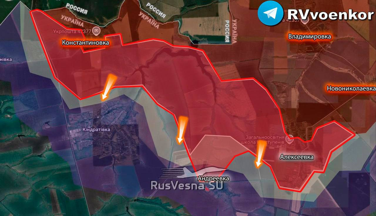 ▪️Các đơn vị thuộc nhóm quân "Bắc" đã giành lại quyền kiểm soát hoàn toàn Konstantinovka và đang tiến công từ phía bắc và phía đông, bắt đầu cuộc tấn công vào Kondratovka.