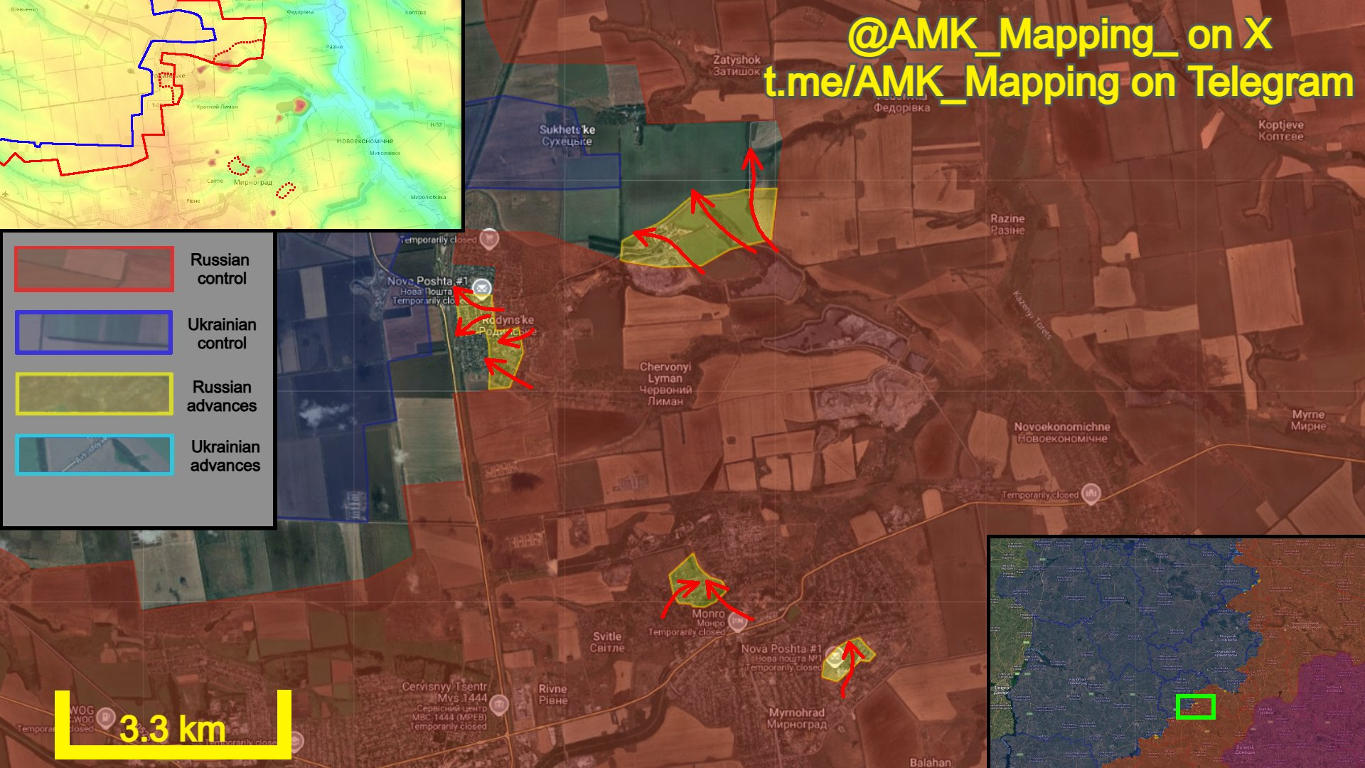 Tại Myrnohrad, sau các chiến dịch truy quét quy mô lớn, lực lượng Nga đã kiểm soát được các khu phố dân cư thấp tầng còn lại ở phía tây bắc thành phố. Họ cũng chiếm được các tòa nhà cao tầng còn lại ở phía đông bắc, qua đó thiết lập quyền kiểm soát hoàn toàn thành phố.