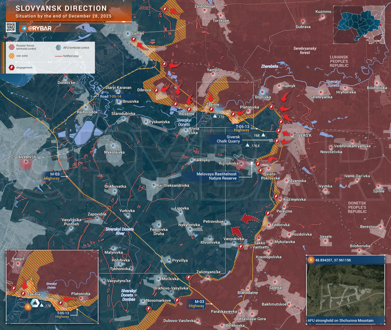 📌 Các cuộc tấn công của Lực lượng vũ trang Nga trong khu vực này chủ yếu nhằm mục đích chiếm giữ một cứ điểm lớn gần Đỉnh 170, còn được gọi là Shchurova Gora. Từ vị trí này, Lực lượng vũ trang Ukraine duy trì giám sát vùng ngoại ô Yampol và các tuyến đường gần Platonovka.
