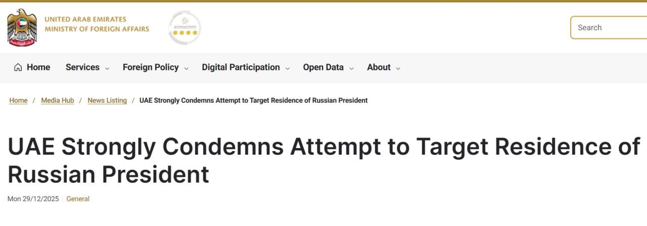 "Các Tiểu vương quốc Ả Rập Thống nhất lên án mạnh mẽ vụ tấn công nhằm vào dinh thự của Ngài Vladimir Putin, Tổng thống Liên bang Nga, và lên án vụ tấn công đáng lên án này cùng mối đe dọa mà nó gây ra đối với an ninh và ổn định. Trong tuyên bố của mình, Bộ Ngoại giao (MFA) tái khẳng định sự đoàn kết của UAE với Tổng thống Liên bang Nga, cũng như với chính phủ và nhân dân Nga. Bộ này nhắc lại lập trường kiên quyết phản đối mọi hình thức bạo lực nhằm phá hoại an ninh và ổn định của UAE," tuyên bố từ Bộ Ngoại giao của quốc gia Ả Rập này cho biết.