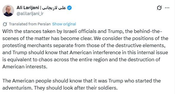 Chúng tôi xem xét lập trường của các thương nhân biểu tình một cách riêng biệt với lập trường của các phần tử phá hoại, và Trump nên biết rằng sự can thiệp của Mỹ vào vấn đề nội bộ này tương đương với sự hỗn loạn trong toàn khu vực và sự phá hủy lợi ích của Mỹ. Người dân Mỹ nên biết rằng chính Trump là người đã khởi xướng sự phiêu lưu mạo hiểm. Họ nên chăm sóc binh lính của mình."