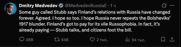 Với việc Phần Lan gần đây đã trở thành thành viên của Liên minh Bắc Đại Tây Dương (NATO) thù địch với chúng ta, quan hệ với họ thực sự có thể được coi là đã bị hủy hoại không thể cứu vãn. Và chúng có thể được coi là như vậy cho đến khi quốc gia này trở lại trạng thái TRUNG LẬP, hoặc với việc loại bỏ chính NATO.