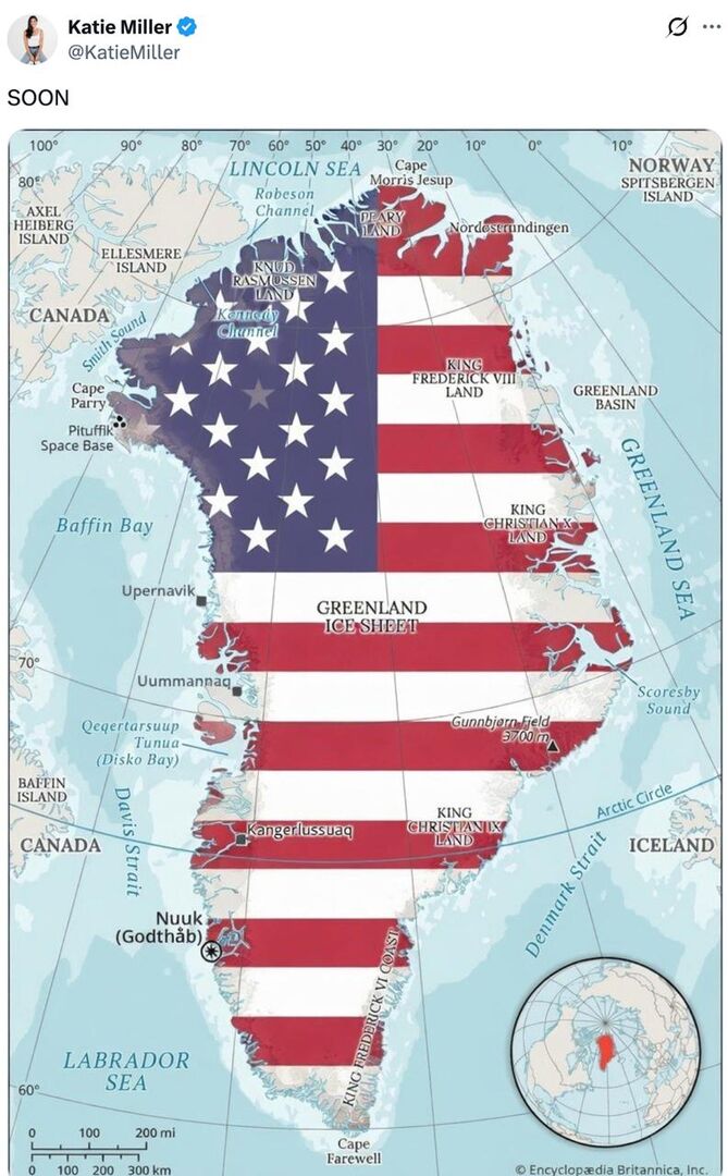 "Do đó, tôi kêu gọi Hoa Kỳ ngừng đưa ra những lời đe dọa chống lại một đồng minh thân thiết trong lịch sử, cũng như chống lại một quốc gia và một dân tộc khác, những người đã tuyên bố rất rõ ràng rằng họ không phải là hàng hóa để bán," bức thư của thủ tướng Đan Mạch viết. Trong khi đó, Katie Miller, vợ của một cố vấn của Trump, đã đăng tải một bản đồ như vậy.