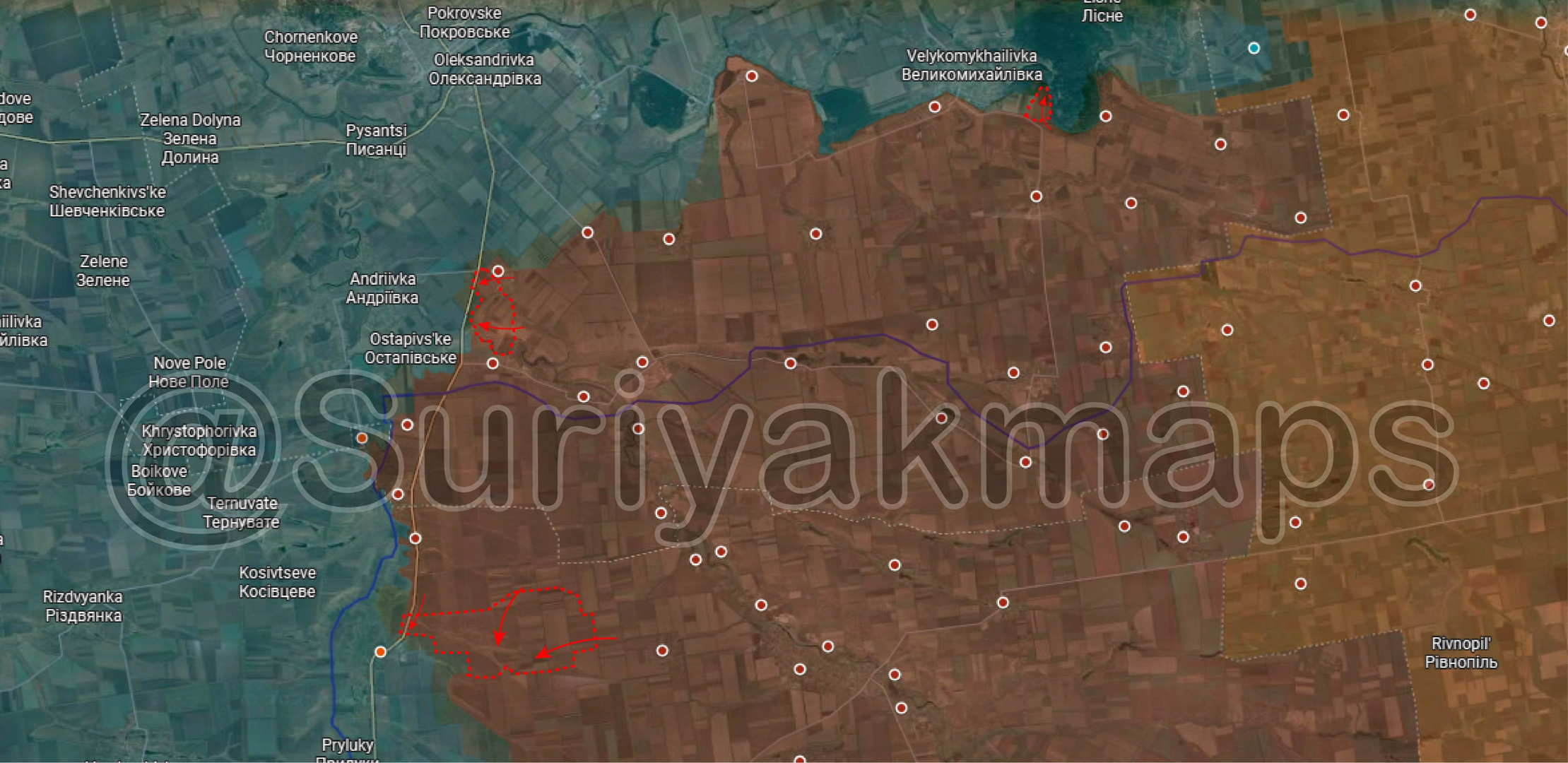 Tình hình mặt trận Velikomikhailovskaya, Pokrovskaya và Huliaipole: Trong ba ngày qua, Quân đội Nga đã có những bước tiến mới tại khu vực rừng phía đông Orestopil. Ngoài ra, trong hai ngày qua, quân đội Nga đã chiếm được một loạt vị trí giữa Vidradne và Danylivka. Hơn nữa, quân đội Nga tiếp tục tiến công ở phía bắc Dobropillya và chiếm được các vị trí còn lại ở phía đông khu vực này.