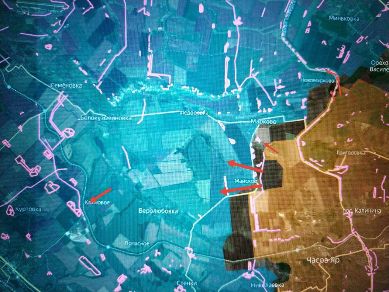 Về phía đông, quân đội Nga đang đẩy mạnh phòng thủ của lực lượng Kiev về phía tây bắc Chasov Yar, ngoại ô Verolyubovka, đánh bật quân địch khỏi Maysky, tiến đến Markovo và đánh bật lực lượng Kiev ở phía đông Novomarkovo dọc theo kênh đào, đột phá và vượt qua các ổ kháng cự. Klinovoye đã được chiếm bằng cách đánh bọc sườn Verolyubovka.