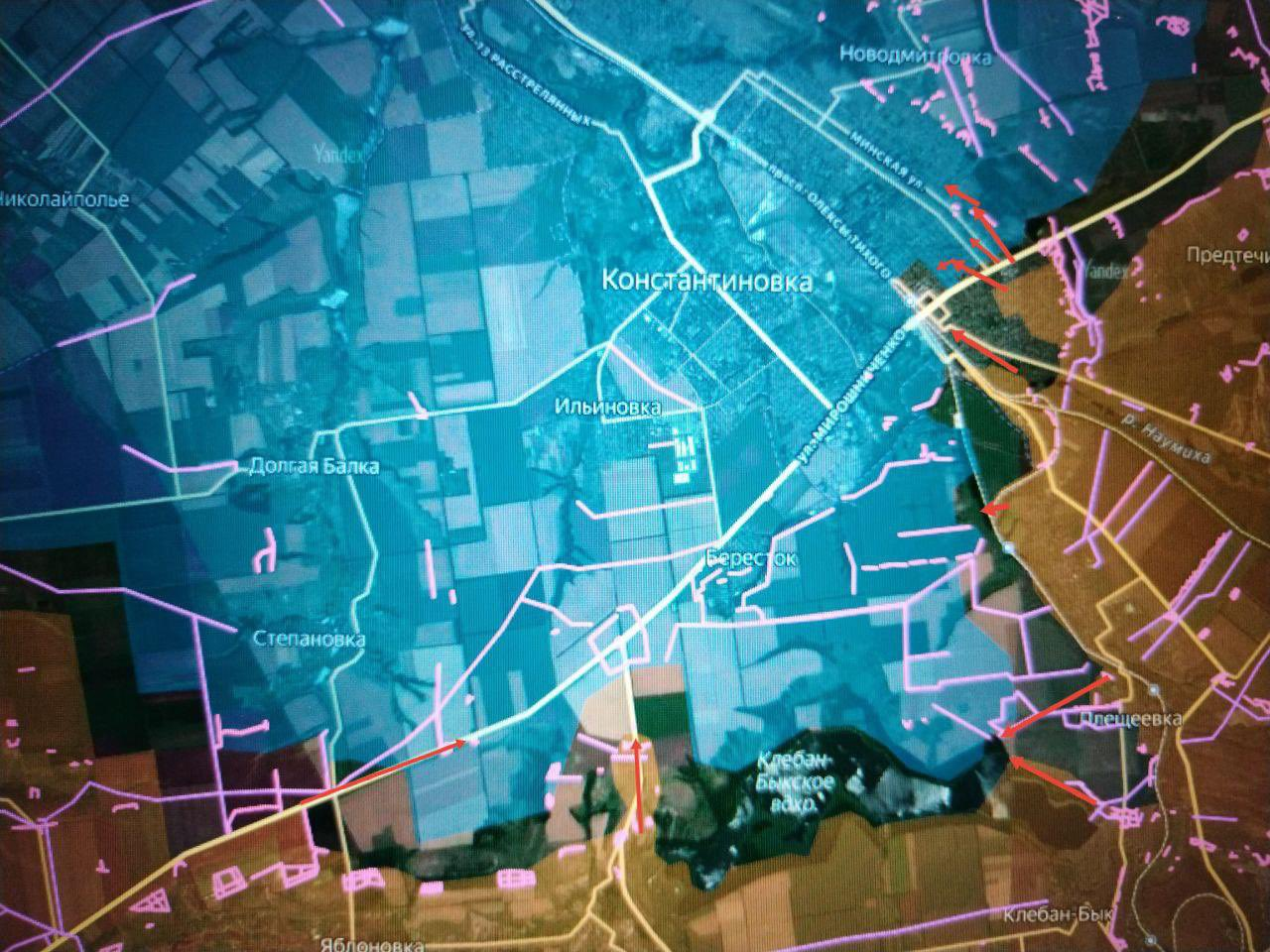 Tại Konstantinovka, các đơn vị Nga đã đột phá qua tuyến phòng thủ của lực lượng Kiev từ phía đông nam và đang giao tranh quanh các phố Krivorozhskaya, Krasnodarskaya và Kievskaya, cũng như Đại lộ Oleksa Tykhy. Phần lớn phố Sobornosti hiện do các đơn vị tấn công Nga kiểm soát. Trên thực tế, lực lượng Nga đã tiến đến khu vực ga đường sắt.