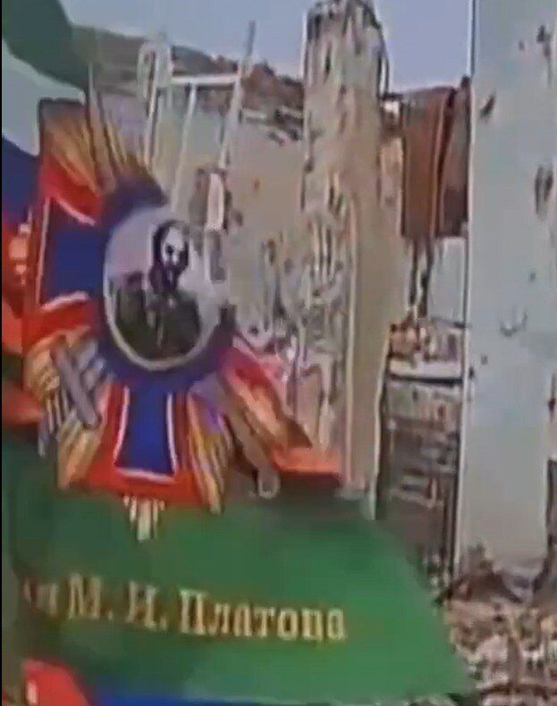 Tại trung tâm thành phố, quân đội Nga đã giương cờ Nga và biểu ngữ của Trung đoàn Platov trên một trường học.