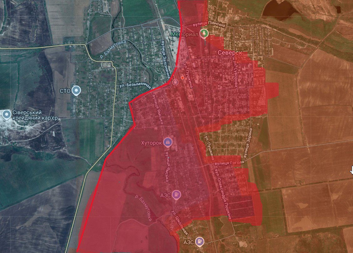 Bản đồ tô màu có thể không hoàn toàn chính xác, nhưng đây là những con phố mà Quân đội Nga đã đóng quân tại Seversk: Zheleznodorozhnaya và Pochtovaya, Mayakovsky và Chernyshevsky, Lomonosov, Centralnaya, Krupskaya, Lugovaya, Pavlova, Yamskaya, Tchaikovsky. Tất cả những con phố này đều đã bị chiếm trong ngày hôm nay.