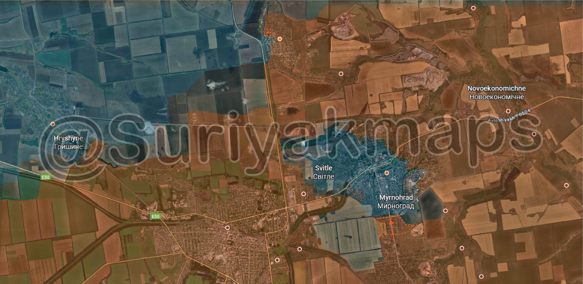 Tình hình mặt trận Mirnograd và Pokrovsk: Trong 48 giờ qua, Quân đội Nga đã kiểm soát hoàn toàn khu vực trung tâm thành phố Myrnohrad. Ngoài ra, trong hai tuần qua, quân đội Nga tiếp tục đạt được những bước tiến nhỏ ở phía tây thị trấn Rodynske.