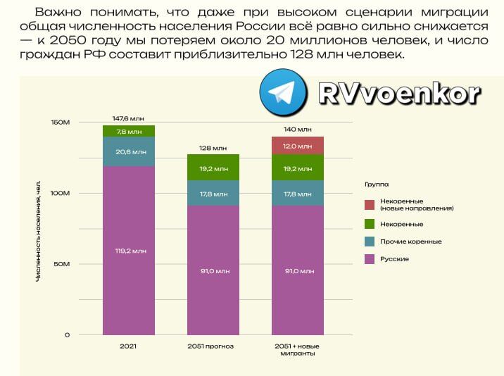 ▪️ Tỷ lệ người nước ngoài trong số công dân Nga sẽ tăng từ 5% hiện tại lên 13% vào năm 2050. Do dòng người di cư, số lượng người nhập cư sẽ đạt 19 triệu.