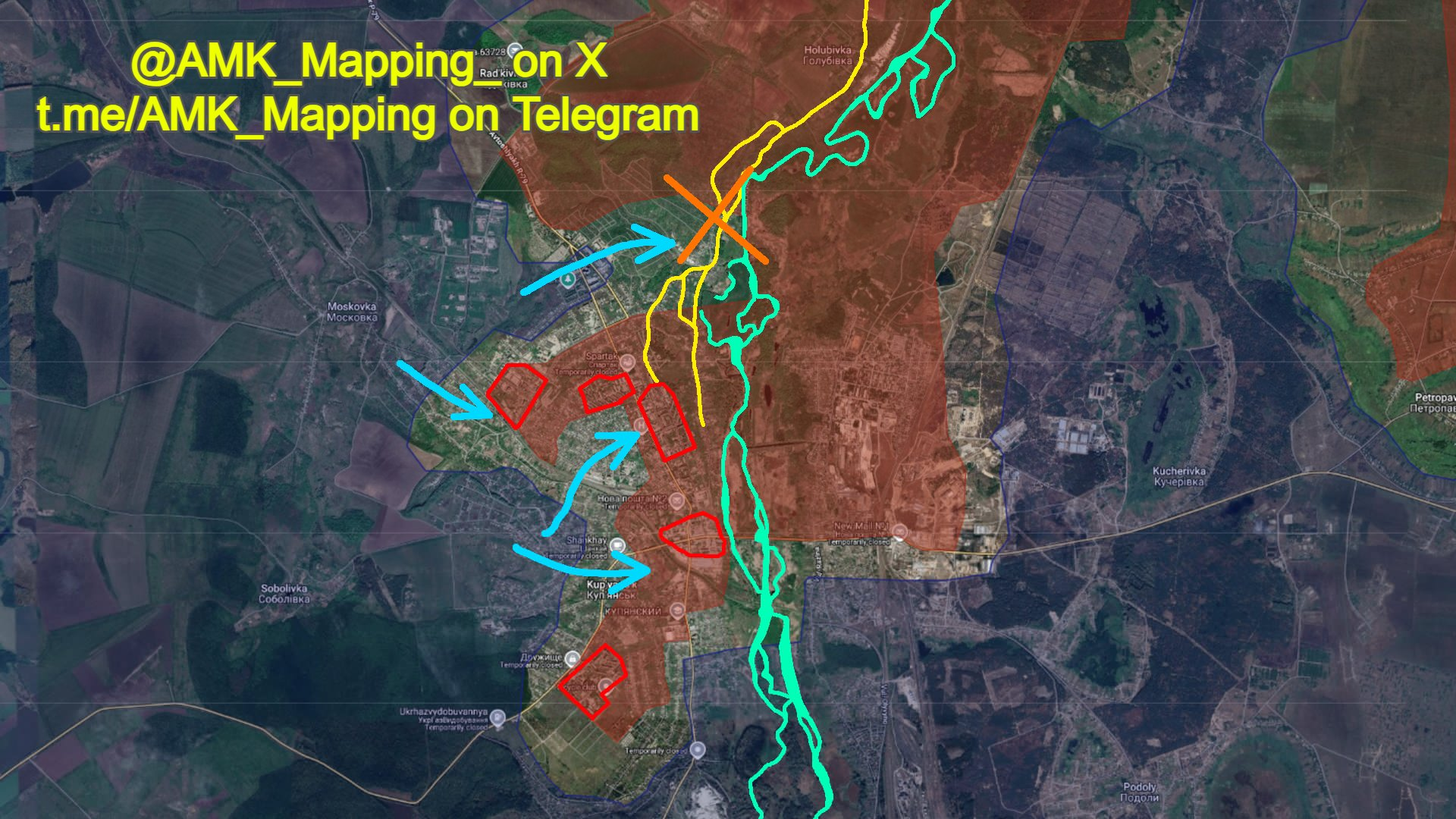 Các đường màu vàng thể hiện các tuyến đường tiếp tế trước đây của Nga, hiện phần lớn không thể đi qua do sự hiện diện của binh lính Ukraine tại đây, những người đã cố gắng tiếp cận bờ tây sông Oskil. Điều này đã đạt được sau nhiều tuần phản công của Ukraine. Tuy nhiên, hiện tại không có bằng chứng nào cho thấy sự củng cố tại đó.