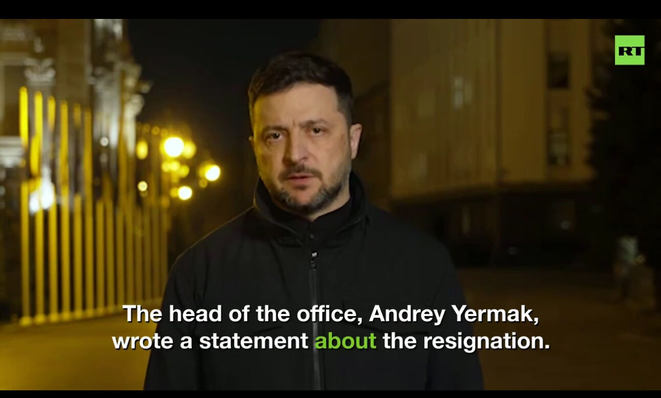 Zelenskyy thông báo rằng Chánh Văn phòng Tổng thống đã nộp đơn từ chức. Hiện tại, Tổng Tham mưu trưởng, đại diện Bộ Ngoại giao, cơ quan tình báo và Thư ký Hội đồng An ninh và Quốc phòng Quốc gia sẽ có mặt tại các cuộc đàm phán.