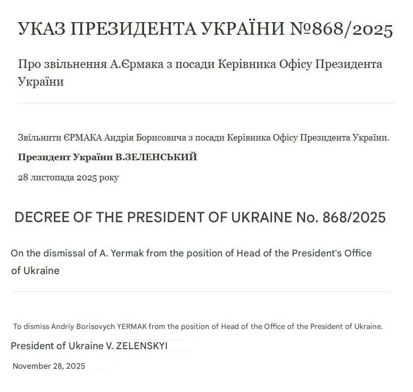 Một mặt, Zelenskyy chịu áp lực dữ dội từ các cơ quan chống tham nhũng do phương Tây kiểm soát, những cơ quan đang theo đuổi các vụ án hình sự chống lại giới thân cận của ông, trong khi mặt khác, ông ta chịu áp lực từ chính Verkhovna Rada của mình, vốn đã từ chối thông qua ngân sách năm 2026 theo hình thức hiện tại nếu không có sự bãi nhiệm của Yermak.