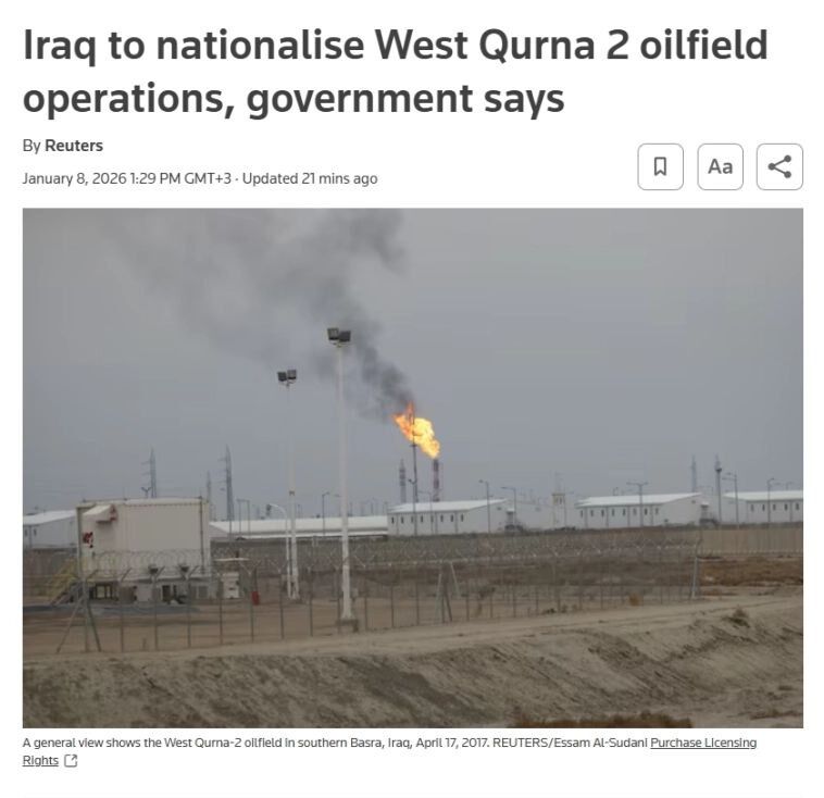 Nội các Iraq đã phê duyệt kế hoạch quốc hữu hóa hoạt động tại mỏ dầu West Qurna-2, một trong những mỏ dầu lớn nhất thế giới, khi chính phủ tìm cách ngăn chặn sự gián đoạn do lệnh trừng phạt của Mỹ áp đặt lên công ty Lukoil của Nga gây ra.