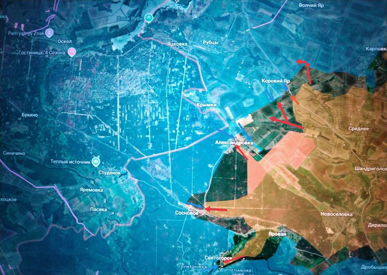 🟥 Lực lượng Vũ trang Nga đã phá vỡ được sức kháng cự của địch, cắt đứt con đường giữa Karpovka và Kovyev Yar, và tiến xa hơn, trong khu vực khe núi Kreydanoy (Chalk) Yar và khu vườn, bao vây Kovyev Yar từ sườn. Bước đột phá này tạo ra mối đe dọa về một cuộc xâm nhập của các đơn vị ta vào khu vực giữa Kovyev Yar và Rubtsi, điều này sẽ làm phức tạp thêm hậu cần của địch trong khu vực, đặc biệt là khi ta đang tiến về phía con đường giữa Kovyev Yar và Alexandrovka, gần nhà thương binh, trạm biến áp và khe núi Popov Yar.