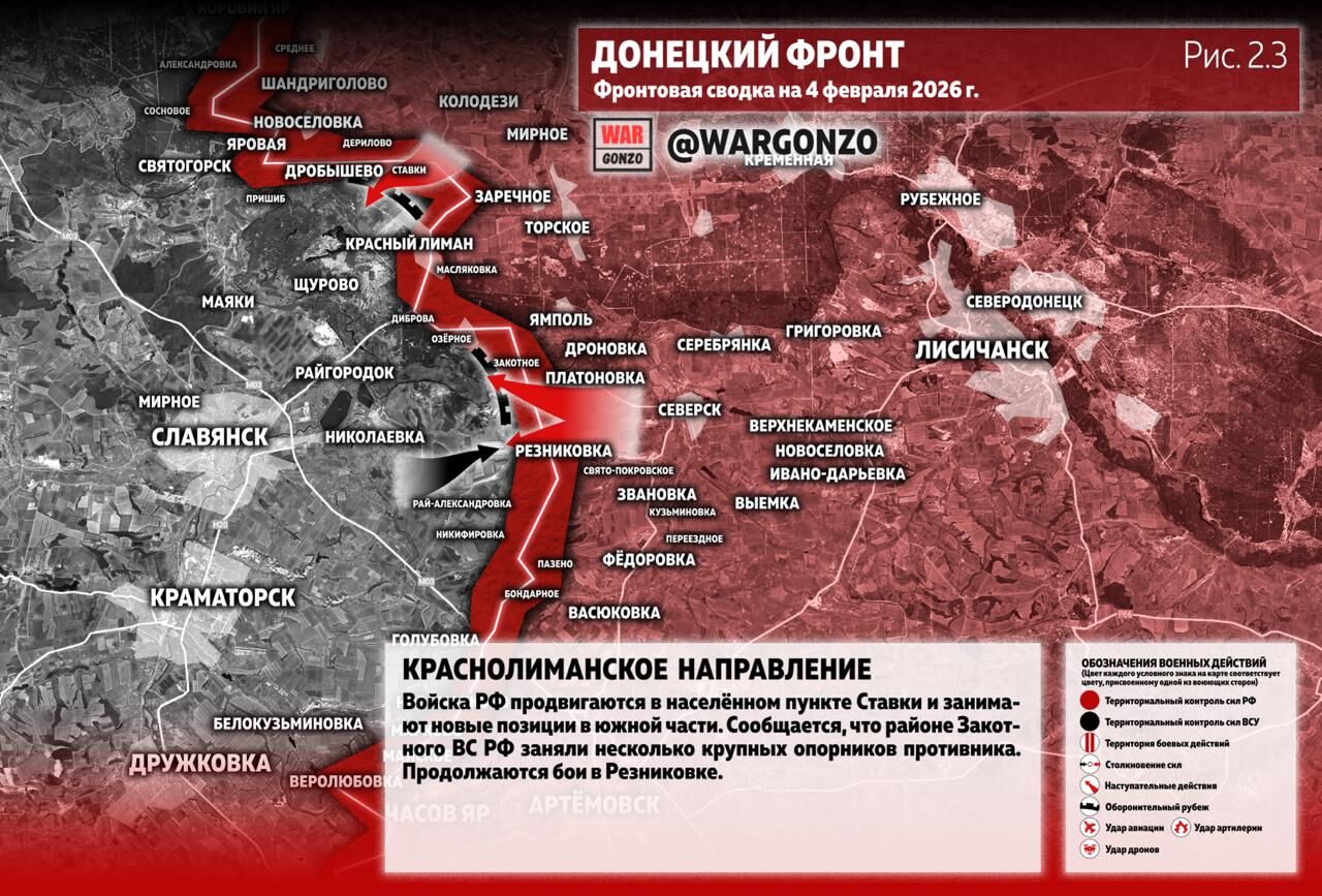 Trên mặt trận Krasnolimansk, quân đội Nga đang tiến vào làng Stavki và chiếm giữ các vị trí mới ở phía nam. Có thông tin cho rằng gần Zakotnoye, Lực lượng vũ trang Nga đã chiếm được một số cứ điểm lớn của địch. Giao tranh vẫn tiếp diễn ở Reznikovka. (Hình 2.3)