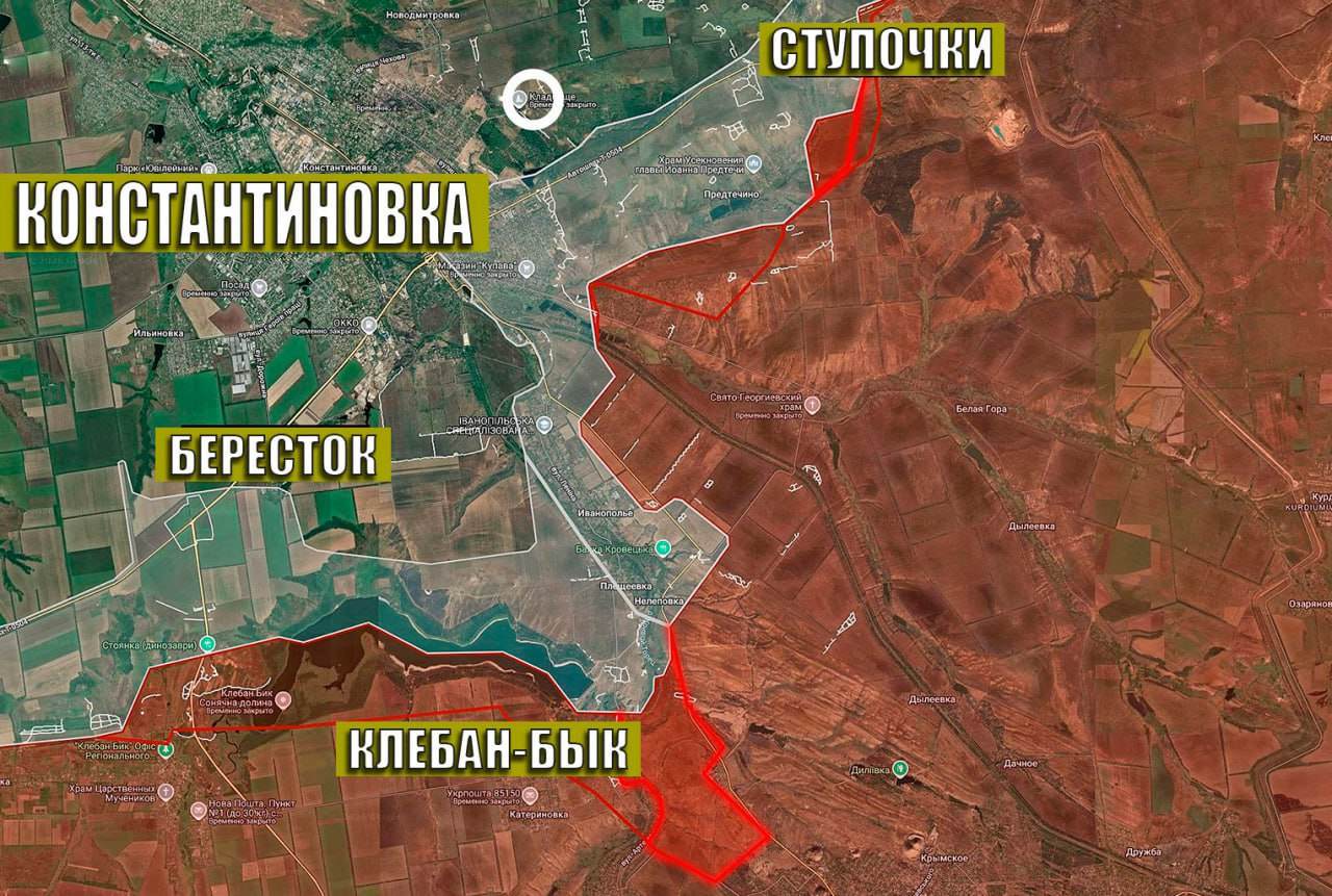 ☄️Theo hướng Konstantinovsk, quân đội Nga đã bao vây "vòng vây" dưới hồ chứa Kleban-Bik và chiếm giữ một cứ điểm giữa 📍Stupochki và 📍Predtechino.