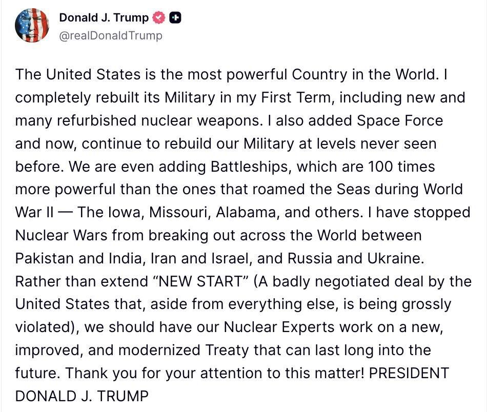 Tổng thống Mỹ nói thêm rằng không cần thiết phải gia hạn Hiệp ước New START, vốn bị cáo buộc là đang bị vi phạm, mà cần một thỏa thuận mới, hiện đại hơn.