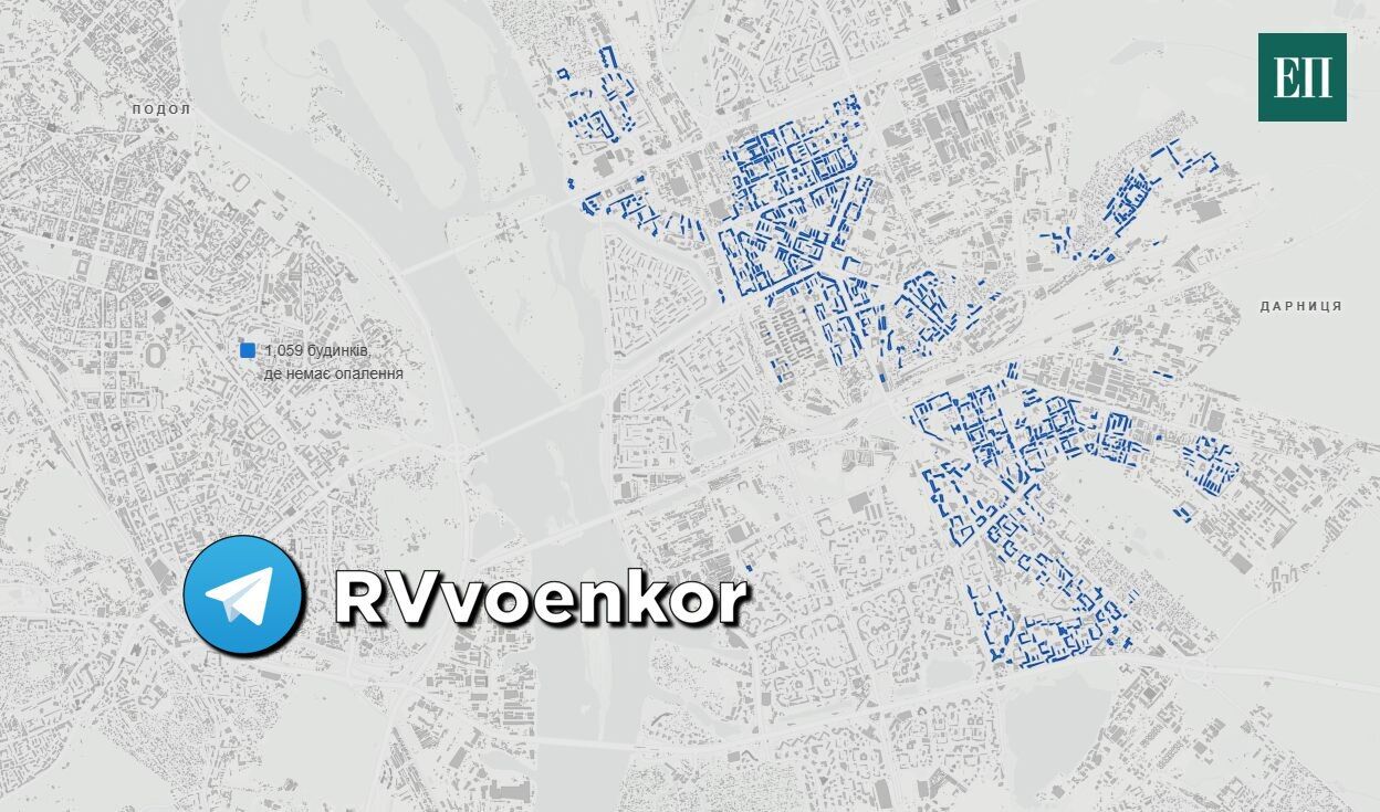 Bản đồ cho thấy những ngôi nhà ở Kyiv sẽ không có hệ thống sưởi ấm cho đến hết mùa đông. Một nửa số nhà ở bờ trái thủ đô Ukraine sẽ không có hệ thống sưởi ấm trong ít nhất hai tháng do nhà máy nhiệt điện Darnytsia bị phá hủy trong một cuộc tấn công gần đây.