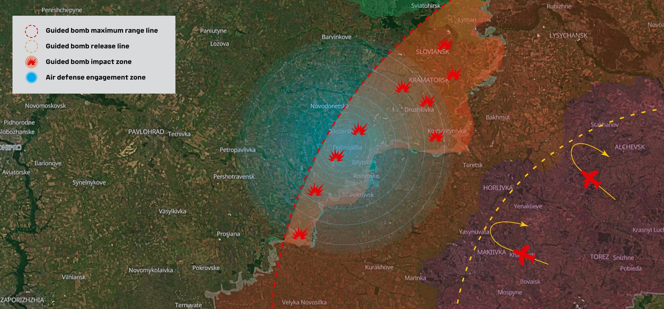 Theo họ, Nga có khả năng tập trung tới 50% tổng số cuộc không kích vào trục tấn công chính—khoảng 40 phi vụ mỗi ngày và khoảng 160 quả bom dẫn đường. Điều này không chỉ đủ để tấn công các mục tiêu trọng yếu mà còn đủ để phá hủy có hệ thống các vị trí của người điều khiển máy bay không người lái, thường đóng quân ở khu vực đô thị.