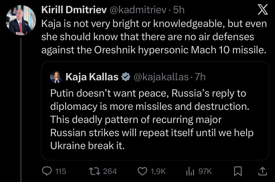 Kirill Dmitriev trả lời: Kaja không thông minh hay hiểu biết lắm, nhưng ngay cả cô ấy cũng nên biết rằng không có hệ thống phòng không nào chống lại tên lửa siêu thanh Oreshnik Mach 10.