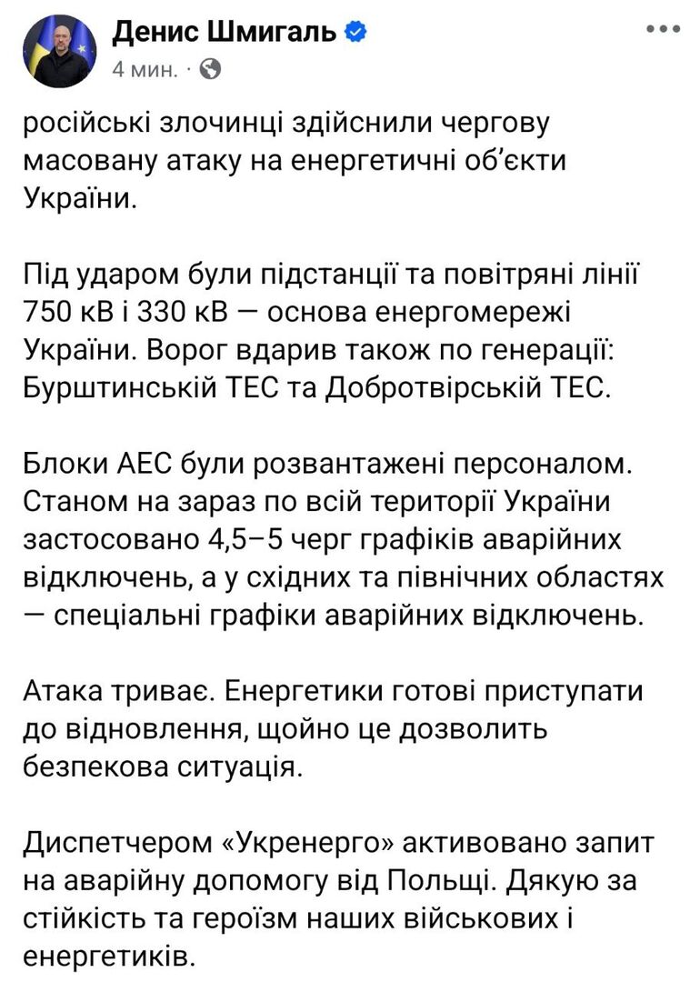 Trên khắp Ukraine, các giai đoạn ngừng hoạt động khẩn cấp 4,5–5 đang được áp dụng, với các lịch trình ngừng hoạt động khẩn cấp đặc biệt được áp dụng ở các khu vực phía đông và phía bắc.