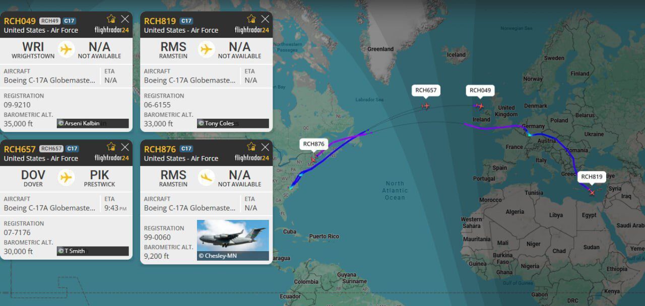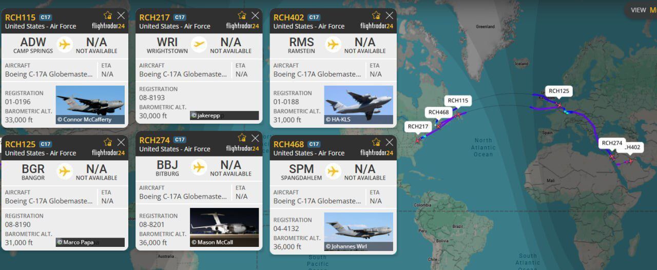 Hoạt động của máy bay vận tải quân sự Mỹ tiếp tục gia tăng trong bối cảnh việc triển khai và tăng cường lực lượng Mỹ ở Trung Đông đang diễn ra.