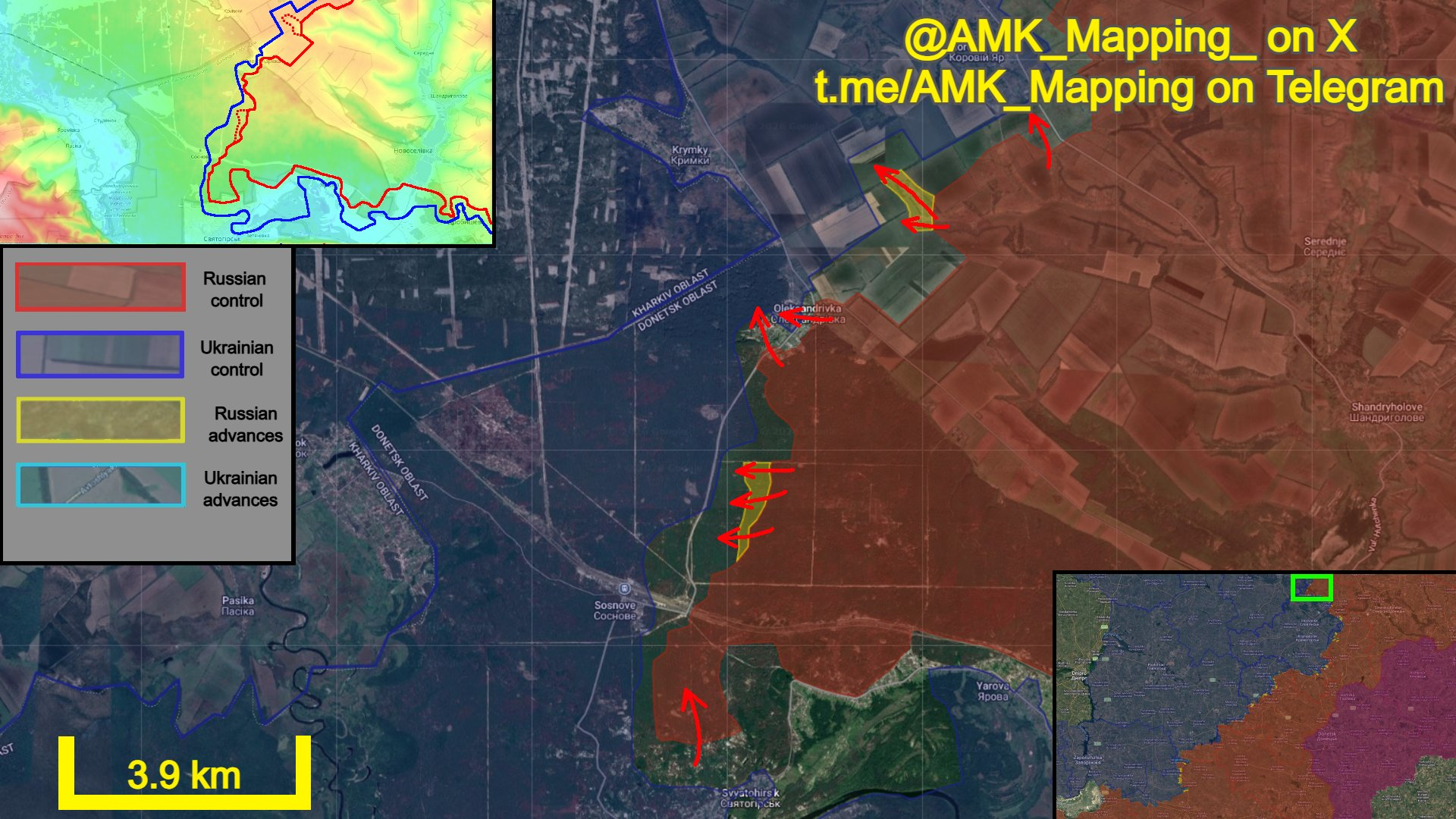 Về phía tây nam, lực lượng Nga tiếp tục tiến chậm qua các khu rừng của Vườn quốc gia Sviati Hory, chiếm được các vị trí mới theo hướng đường Oleksandrivka - Sosnove. Các cuộc tấn công cũng tiếp tục ở phía đông và phía tây Oleksandrivka, nơi quân Nga đã tiến được vào phần phía tây của làng.