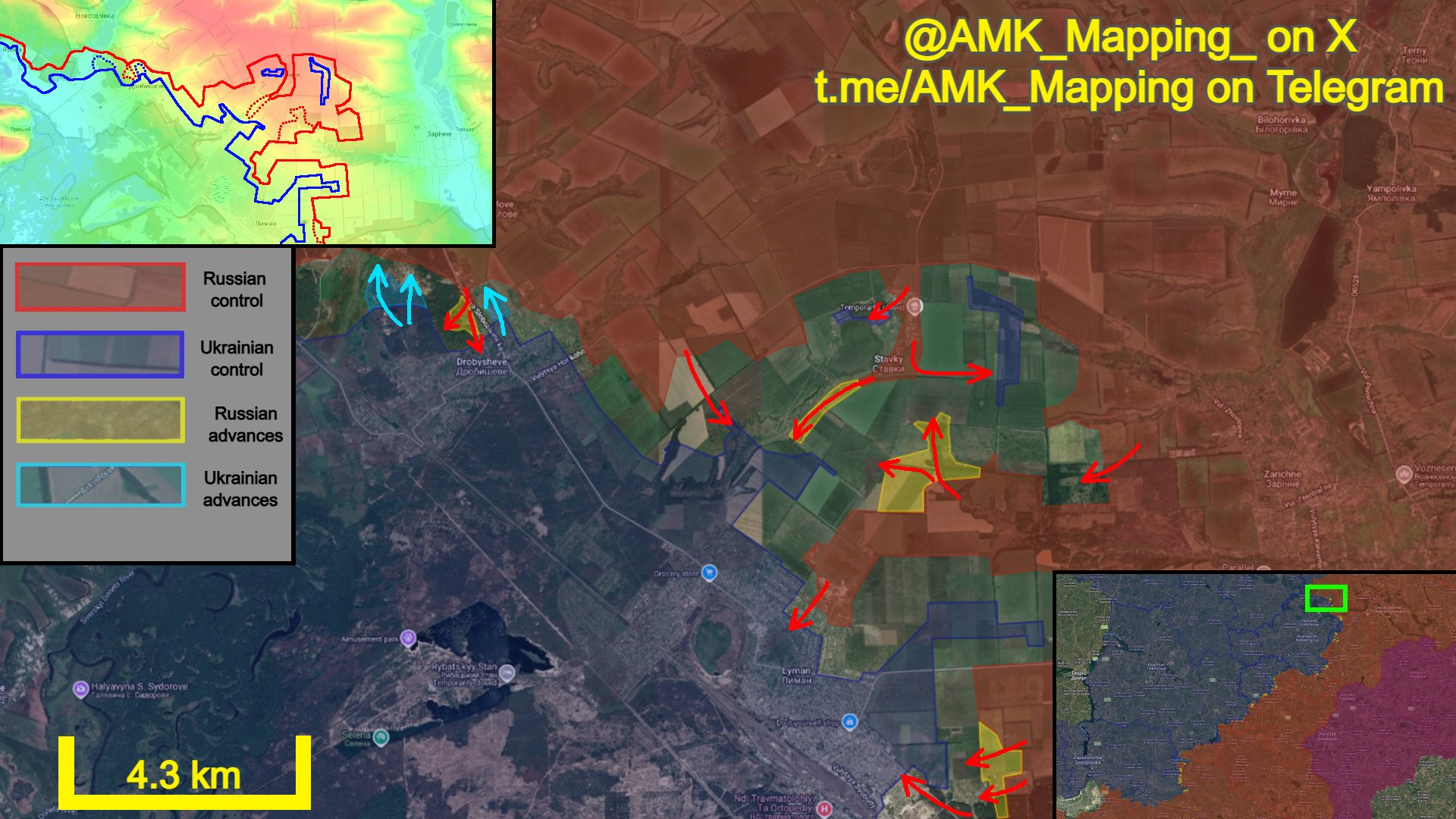 Ở phía đông nam, lực lượng Nga tiếp tục tiến về phía bắc của huyện Masliakivka thuộc tỉnh Lyman, và chiếm giữ các vị trí mới trên tuyến rừng. Điều này cho phép các nhóm tấn công khác tiếp tục các cuộc tấn công của họ trong chính huyện Masliakivka, nơi họ có thể củng cố vị trí và tiến vào phần chính của Lyman. Trong khi đó, các lực lượng khác đã đột phá vào phần đông nam của Lyman từ phía nam một lần nữa, nơi hình thành một vùng xám rộng lớn.