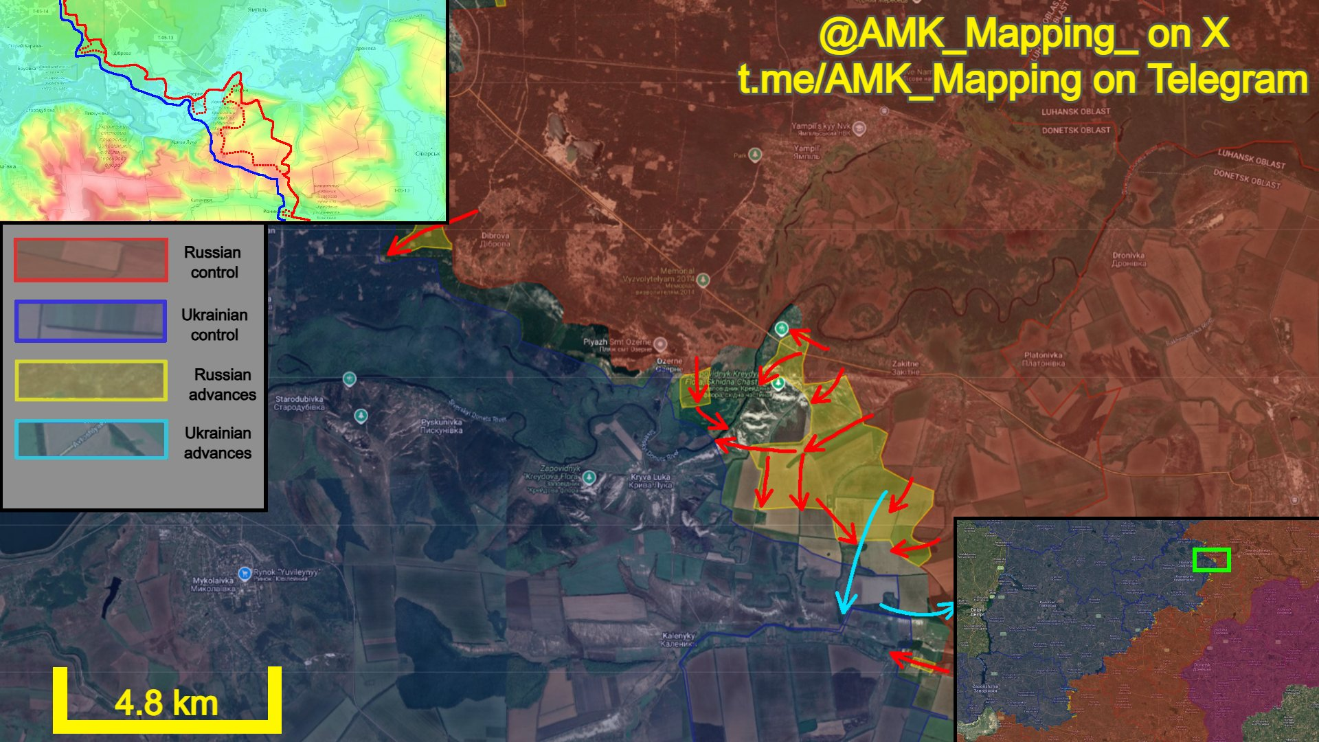 Ở phía tây bắc, lực lượng Nga tiếp tục chọc thủng các vị trí của quân Ukraine dọc theo các đường rừng phía nam Zakitne, và tiến vào các ngọn đồi đá vôi dọc theo bờ đông sông Siverskyi Donets. Điều này cho phép họ chuyển hướng về phía nam và chiếm giữ các vị trí đường rừng phía đông Kryva Luka, trong khi các nhóm tấn công khác chiếm giữ các vị trí trong rừng và đường rừng phía đông, buộc các binh sĩ Ukraine còn lại phải rút lui về phía nam hướng tới các cao điểm chiến thuật phía bắc Riznykivka.