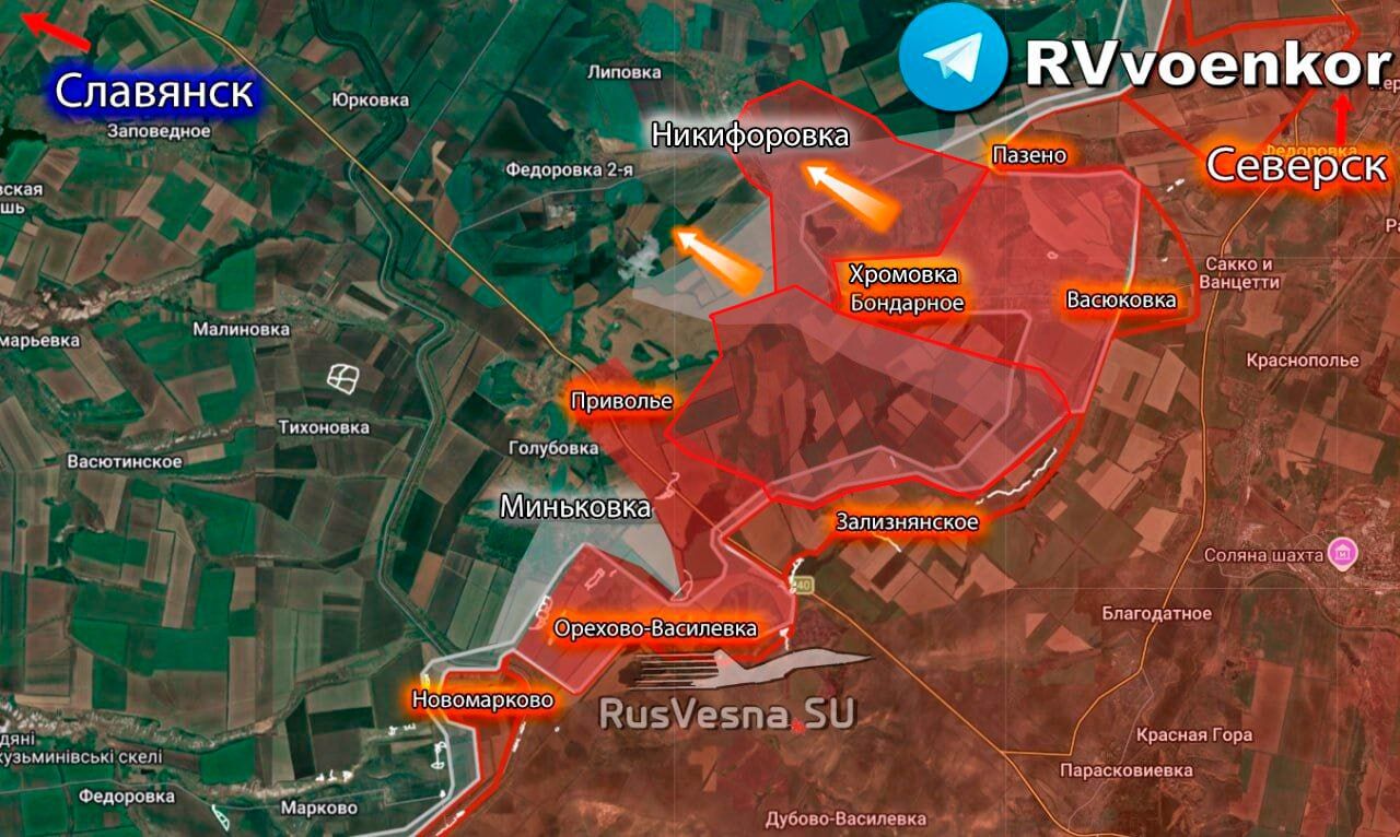 Xa hơn về phía bắc, sau khi giải phóng Seversk, Pazeno, Bondarnoye và Khromovka, nhóm quân "Nam" đã chiếm được trung tâm Nikiforovka và đang tiến đến Fedorovka Vtoraya qua các cánh đồng, tự tin tiến về Slavyansk.