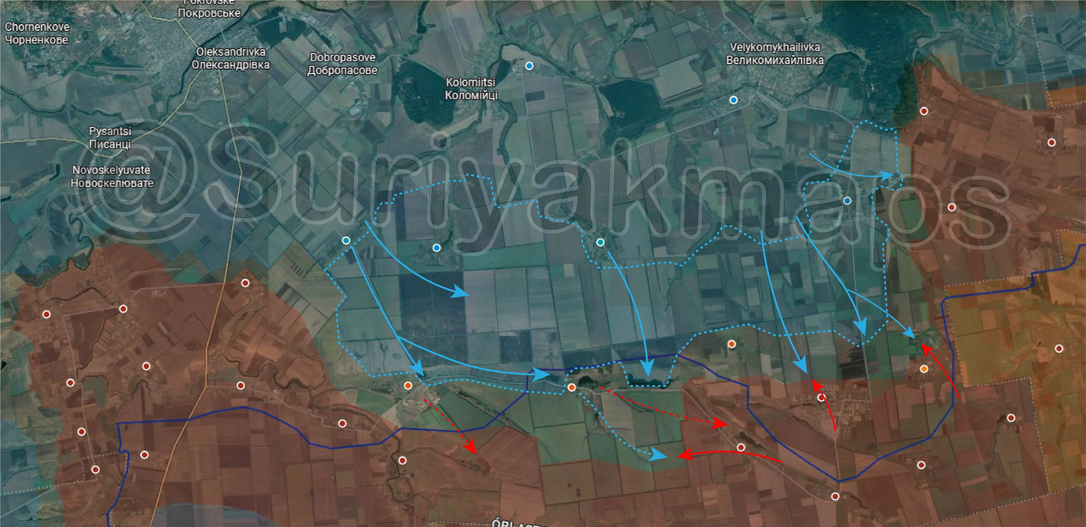 Tình hình mặt trận Pokrovskaya: Trong những ngày gần đây, #QuânĐộiUkraine đã đạt được một loạt thắng lợi ở phía nam sông Vovchansk nhờ một loạt các cuộc phản công cục bộ. Lực lượng Ukraine đã tiến vào Vishneve sau khi đánh đuổi #QuânĐộiNga khỏi khu vực này, cũng như Verbove, nơi họ có thể tiếp tục thâm nhập sâu hơn về phía nam tới Kalynivske. Khu vực Novooleksandrivka, với sự hiện diện của Nga rất ít (hoặc gần như không có), đã hoàn toàn nằm dưới sự kiểm soát của Ukraine.