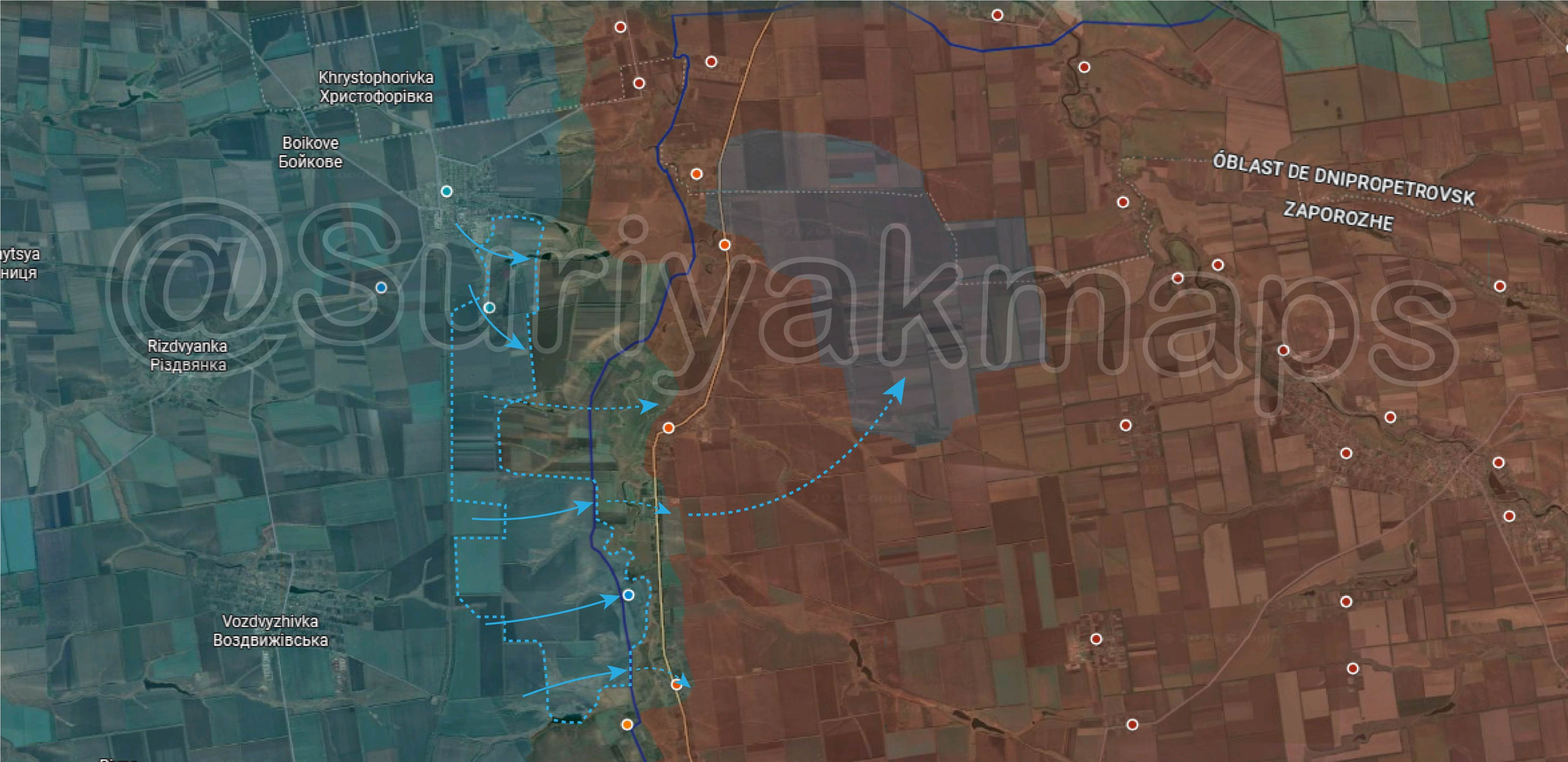 Tình hình trên mặt trận Huliaipole: Trong bốn ngày qua, #QuânĐộiUkraine đã tái chiếm khu vực Kosivtseve và bắt đầu tiến sâu vào phía bắc Dobropillya. Xa hơn về phía nam, lực lượng Ukraine đã chiếm được một loạt vị trí trên bờ tây sông Haichur, bao gồm cả khu vực Pryluky, sau khi đẩy #QuânĐộiNga ra khỏi khu vực. Từ đó, quân đội Ukraine đã vượt sông Haichur và tiến sâu vào phía nam Dobropillya và phía bắc Varvarivka, nơi giao tranh vẫn tiếp diễn mà chưa có sự củng cố vững chắc. Từ đó, quân đội Ukraine đã tiếp cận được khu vực xâm nhập nơi binh lính Ukraine đóng quân từ tháng 12.