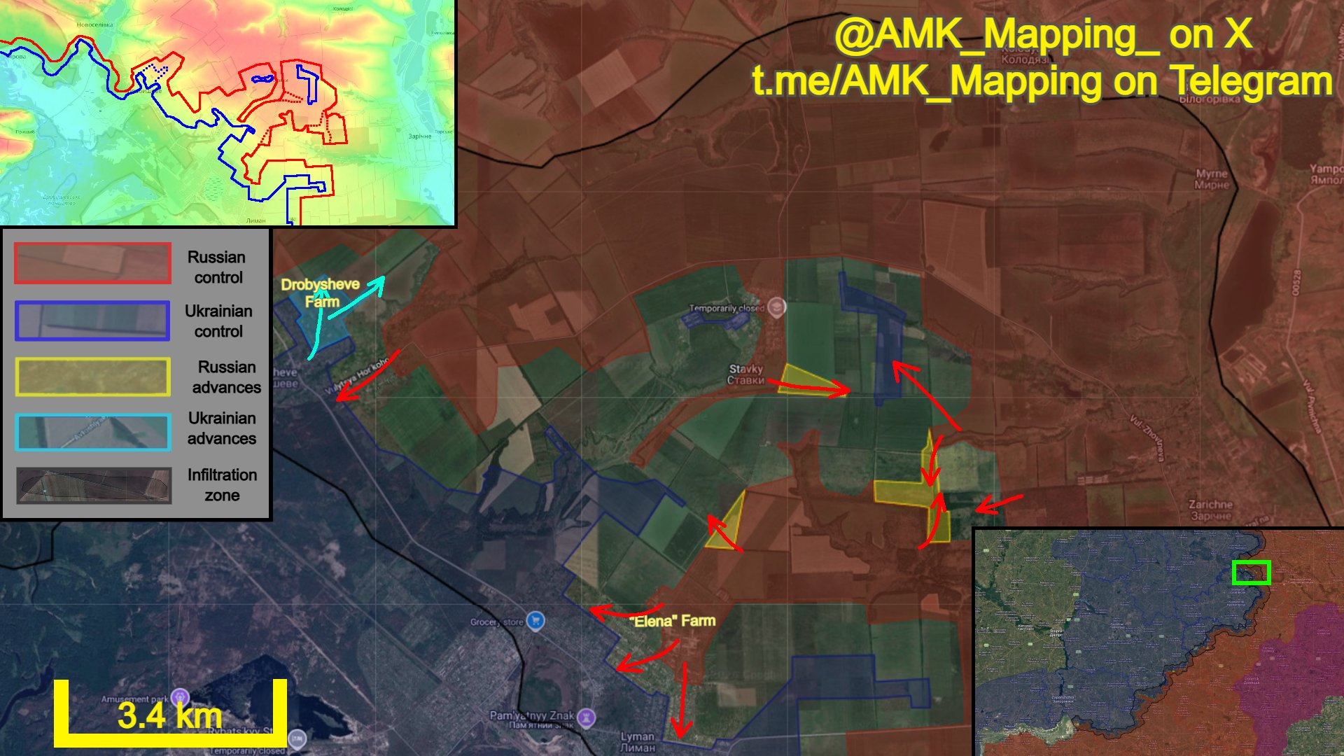 Ở phía nam, quân Nga chiếm thêm các vị trí trong rừng phía tây Zarichne và cắt đứt một số nhóm nhỏ binh lính Ukraine ở đó, mà hiện họ đang tấn công từ phía đông. Ngoài ra, quân Nga củng cố vị trí của họ trên đường ranh giới rừng phía nam Stavky và tiếp tục xâm nhập các tuyến phố phía bắc của Lyman từ khu phức hợp trang trại "Elena".