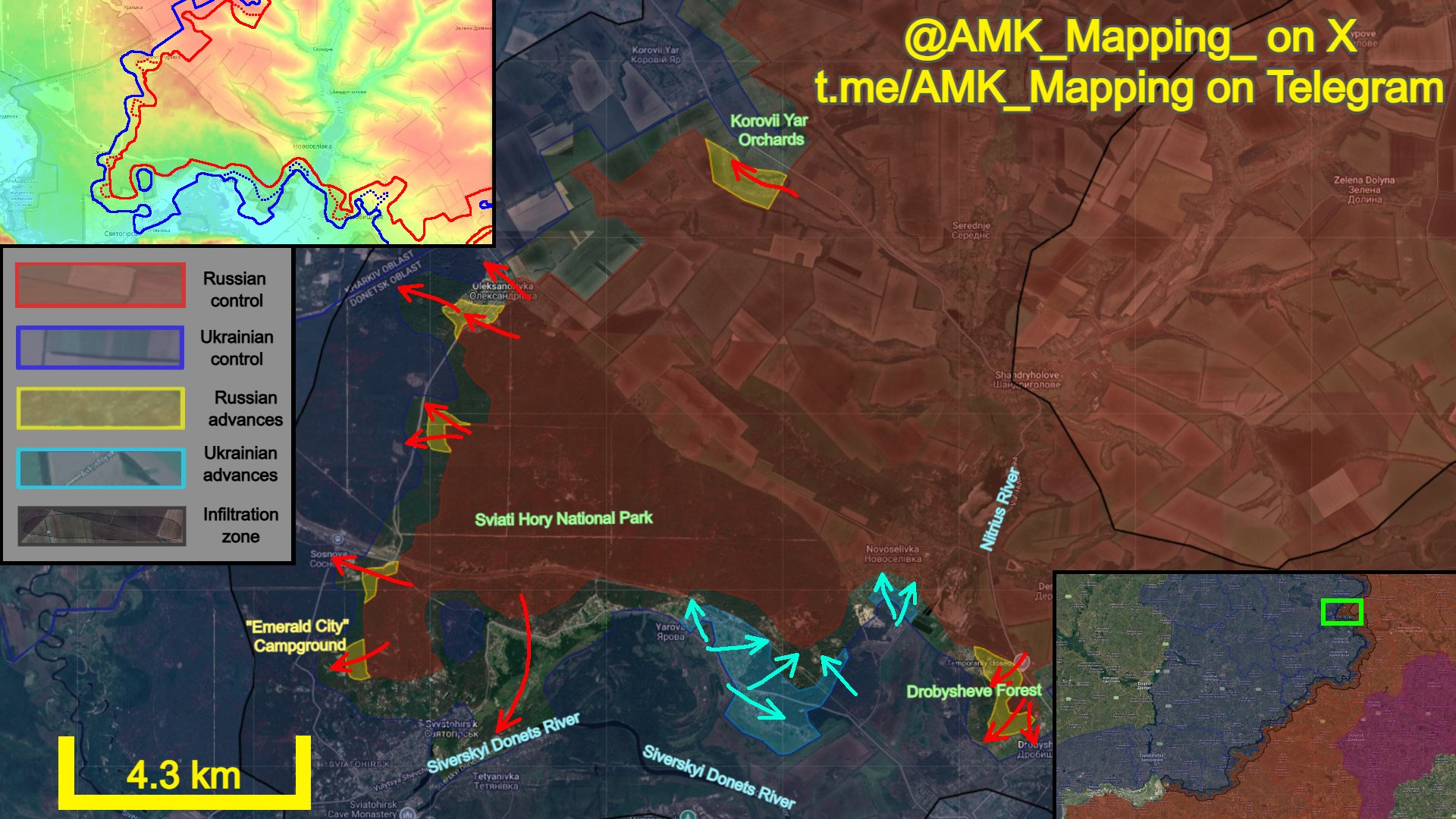 Nga đã tăng cường các hoạt động tấn công và đang tiến quân đều đặn qua một số khu vực kiên cố nhất của chiến tuyến. Các cuộc phản công của Ukraine nhằm làm chậm bước tiến của Nga đã thất bại, và các nhóm xâm nhập của Nga đang tiến sâu hơn về phía tây dọc theo bờ nam sông Siverskyi Donets, xuyên thủng các cứ điểm được cho là sẽ ngăn chặn bất kỳ cuộc tấn công nào của Nga ở phía tây Siversk.