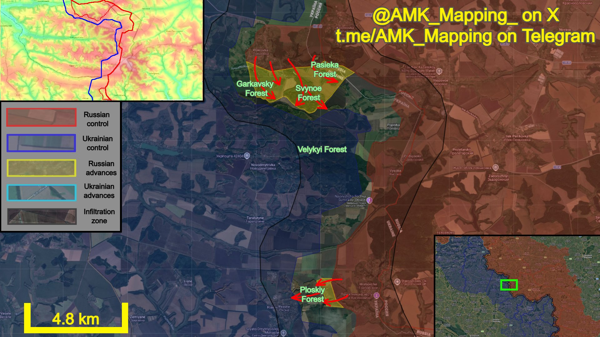 Ở phía bắc, sau khi chiếm được làng Pokrovka, lực lượng Nga bắt đầu tiến về phía nam trên một mặt trận rộng, tiến vào rừng Garkavsky và rừng Pasieka, cho phép họ đẩy lùi quân Ukraine ra khỏi rừng Svynoe. Giao tranh hiện đang diễn ra để tiến vào khu rừng Velykyi rộng lớn hơn.