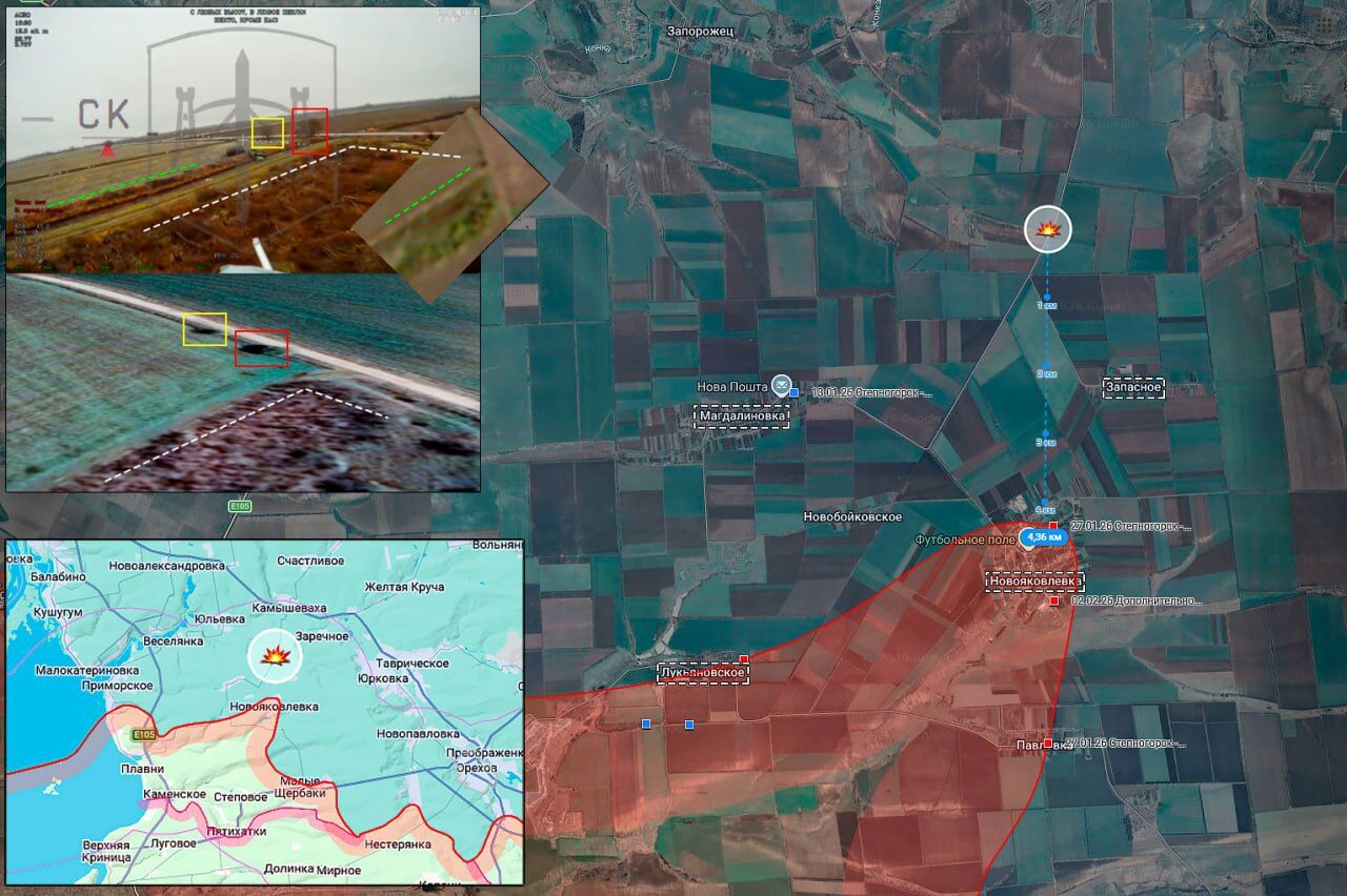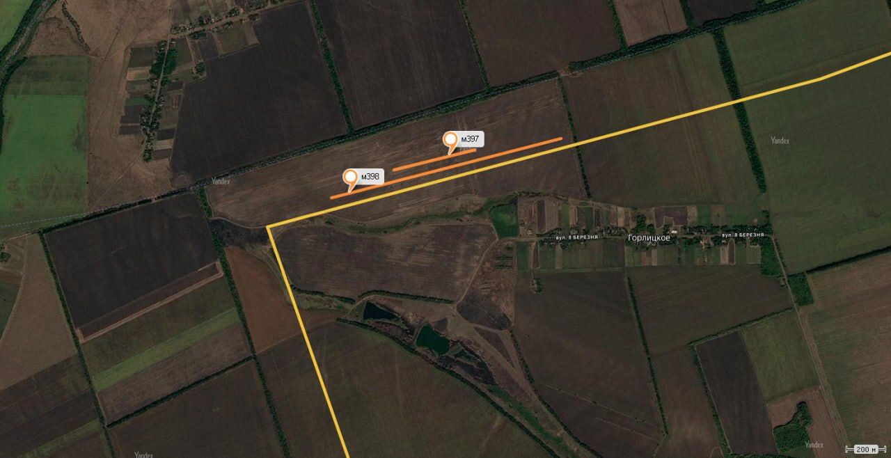 Các công trình kỹ thuật của Lực lượng Vũ trang Ukraine. Thi công: Tháng 2 năm 2026. Chướng ngại vật hào. Đầu tiên, họ căng hàng rào dây thép gai; giờ họ đang xây dựng hào. Tỉnh Zaporizhia, huyện Novomykolaivskyi m397 48.04776 36.00941 m398 48.04627 36.00323