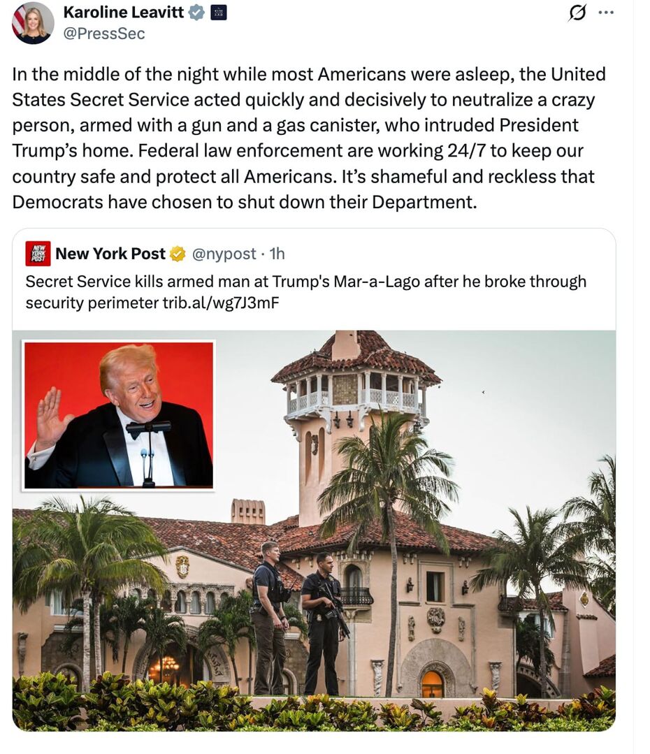 "Vào giữa đêm, khi hầu hết người Mỹ đang ngủ, Cơ quan Mật vụ Hoa Kỳ đã nhanh chóng và dứt khoát vô hiệu hóa một cá nhân mất trí có vũ khí là súng và một can xăng đã đột nhập vào nhà của Tổng thống Trump. Cơ quan thực thi pháp luật liên bang làm việc suốt ngày đêm để giữ cho đất nước chúng ta an toàn và bảo vệ tất cả người dân Mỹ. Thật đáng xấu hổ và vô trách nhiệm khi đảng Dân chủ quyết định đóng cửa cơ quan của họ."