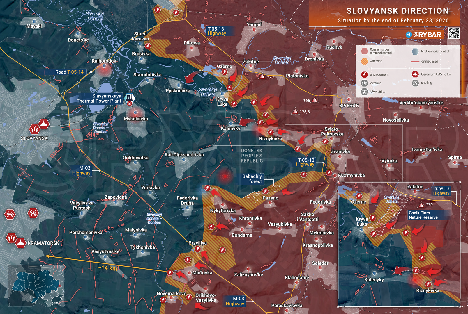 Theo hướng Slavyansk, quân đội Nga tiếp tục tiến công trên các cao điểm ở sườn phía bắc. Một số bước tiến cục bộ đã được ghi nhận trong các vành đai rừng dọc theo tuyến Krivaya Luka-Reznikovka.