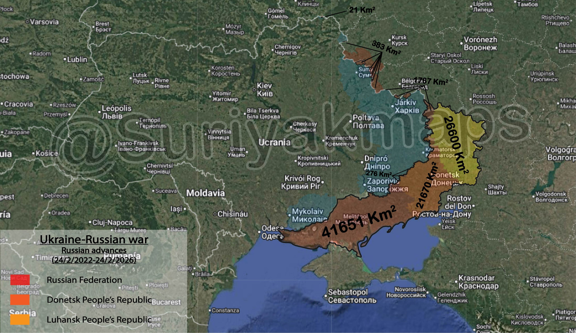 Sau bốn năm kể từ khi Chiến tranh Nga-Ukraina bắt đầu, Quân đội Nga hiện kiểm soát 92092 km2, tương ứng với 15,25% diện tích Ukraine (19,73% bao gồm Bán đảo Crimea):